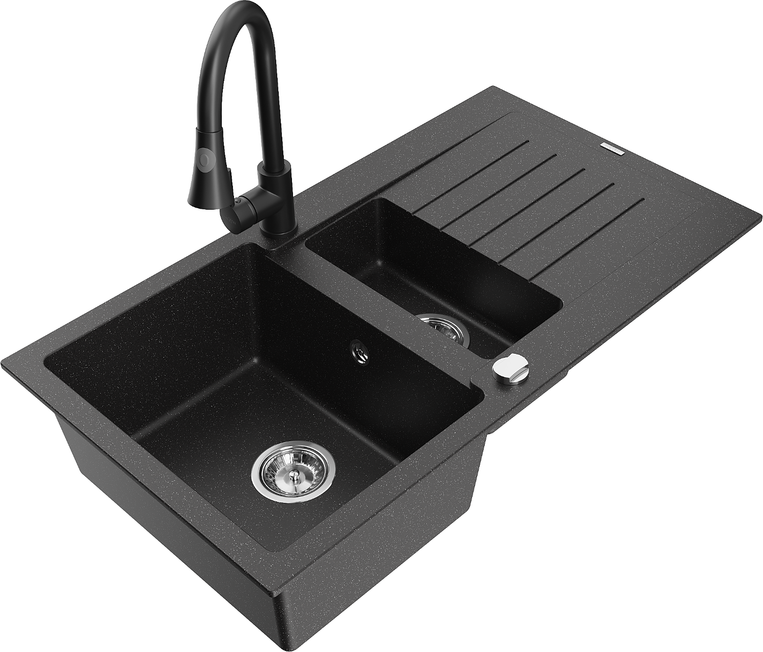 Mexen Matias granito kriauklė su 1,5 dubeniu ir nusausintoju bei virtuviniu maišytuvu Elia, juodas/sidabrinis metalikas - 6502-?