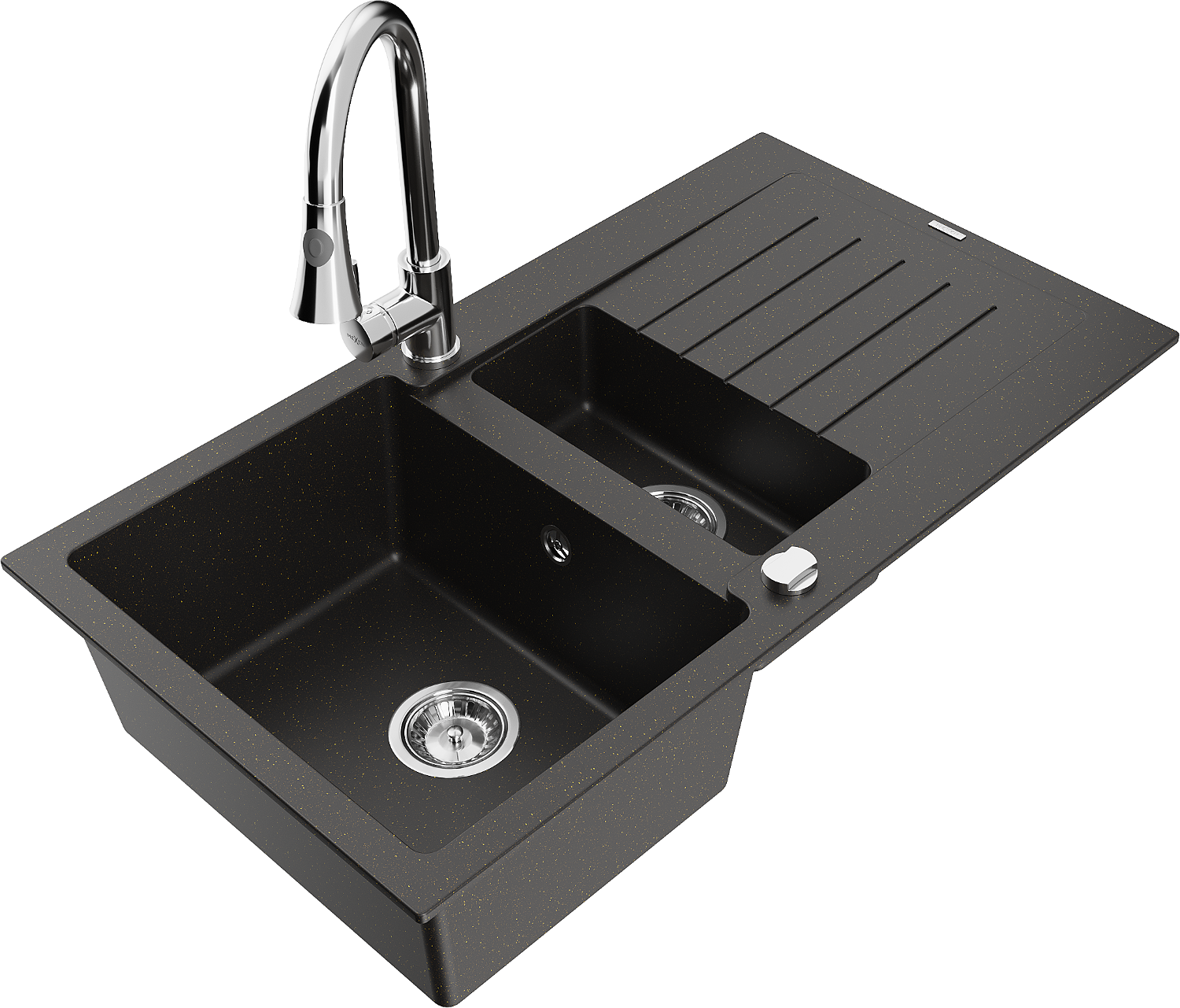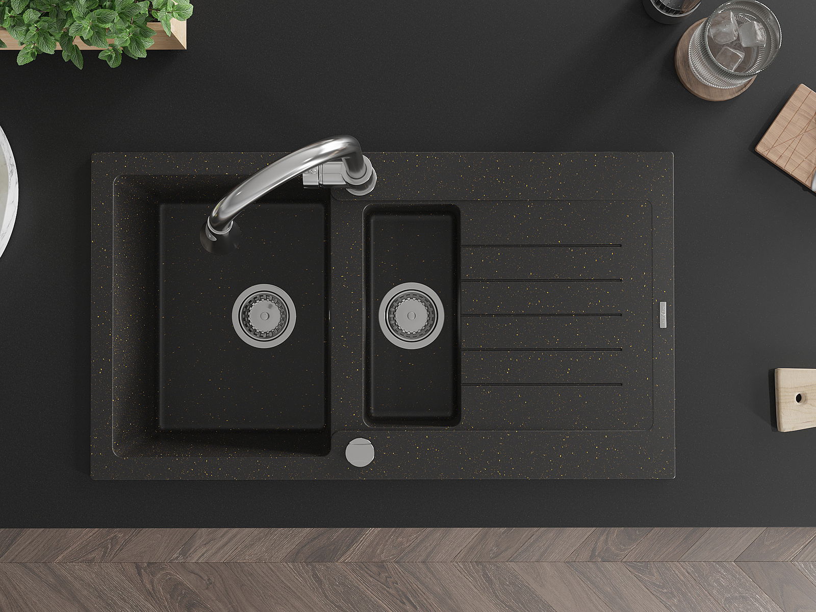 Mexen Matias grindinis plautuvas 1,5 kamerų su lašintuvu ir virtuvės čiaupu Elia, juodas/auksinis metalikas