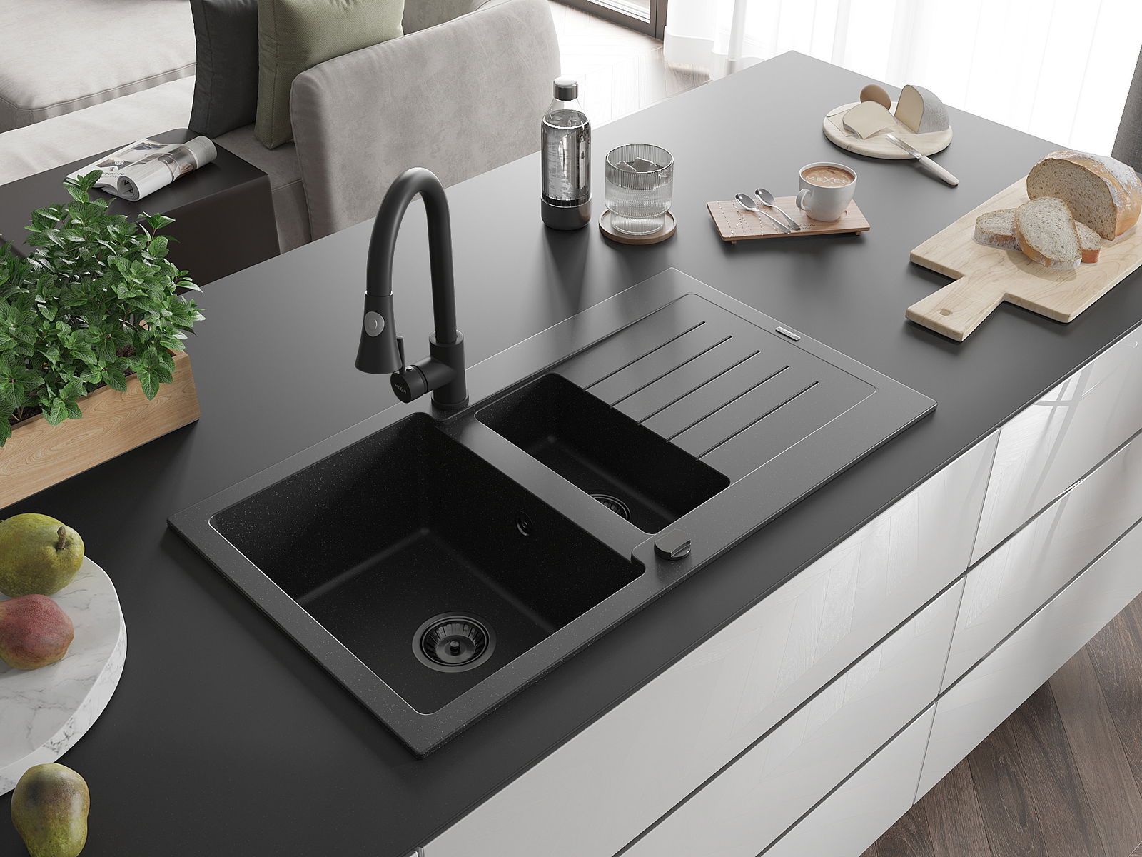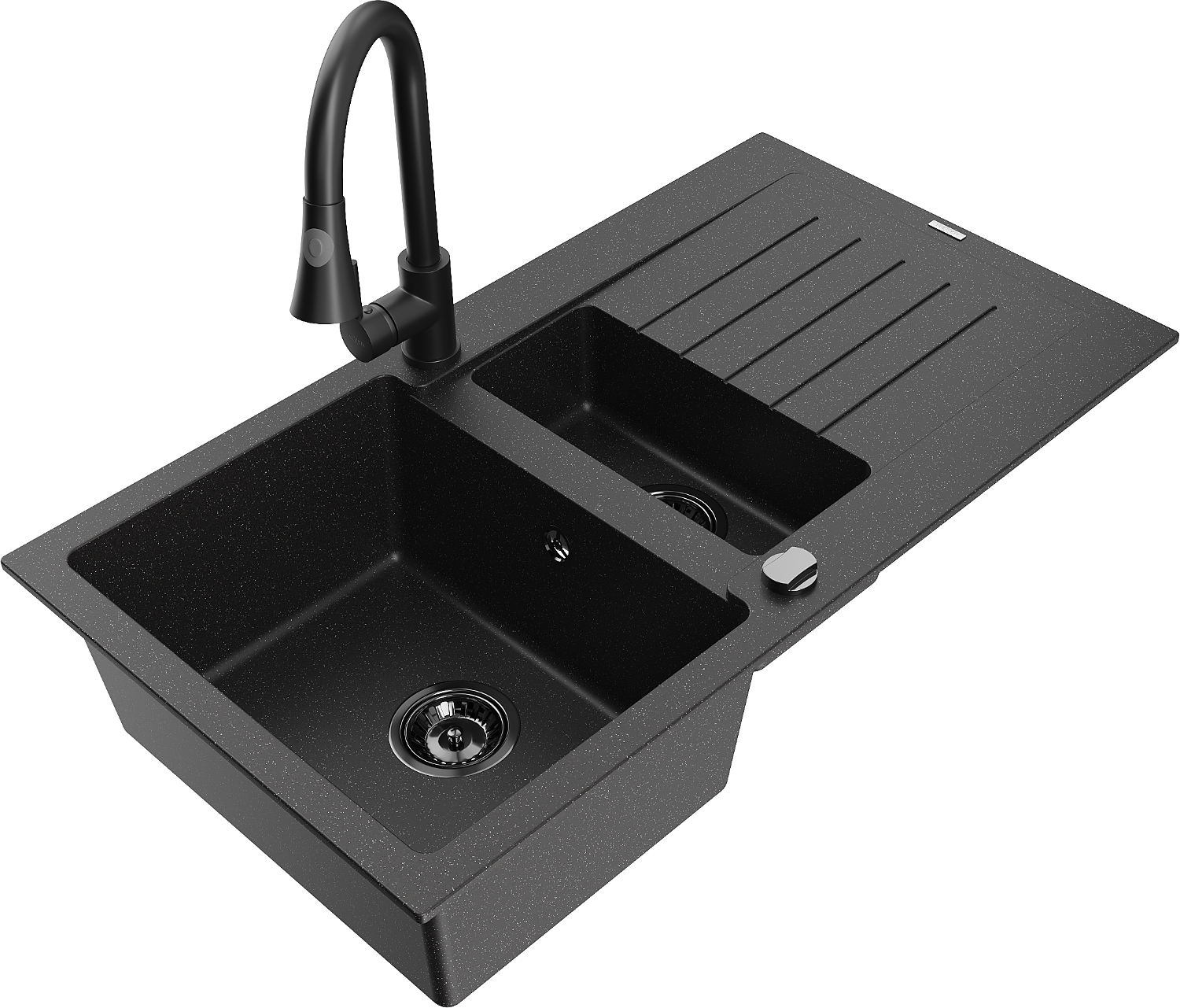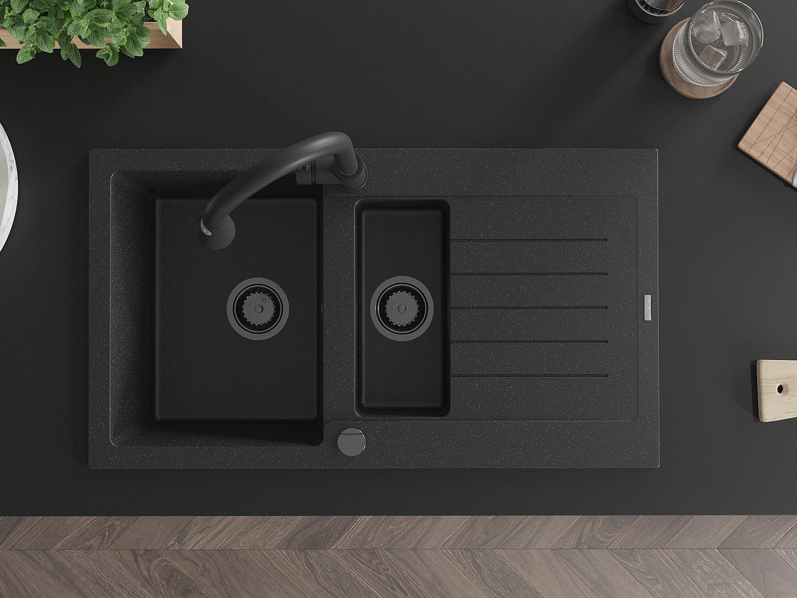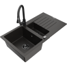 Mexen Matias granitinė kriauklė 1,5 dubens su nusausintuvu ir virtuviniu maišytuvu Elia, juoda/sidabrinė - 6502-73-670101-70-B