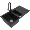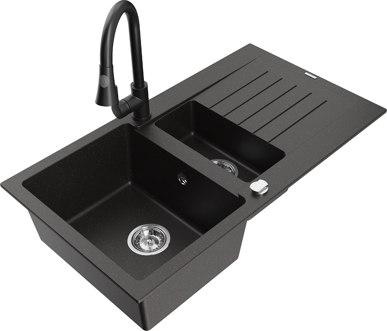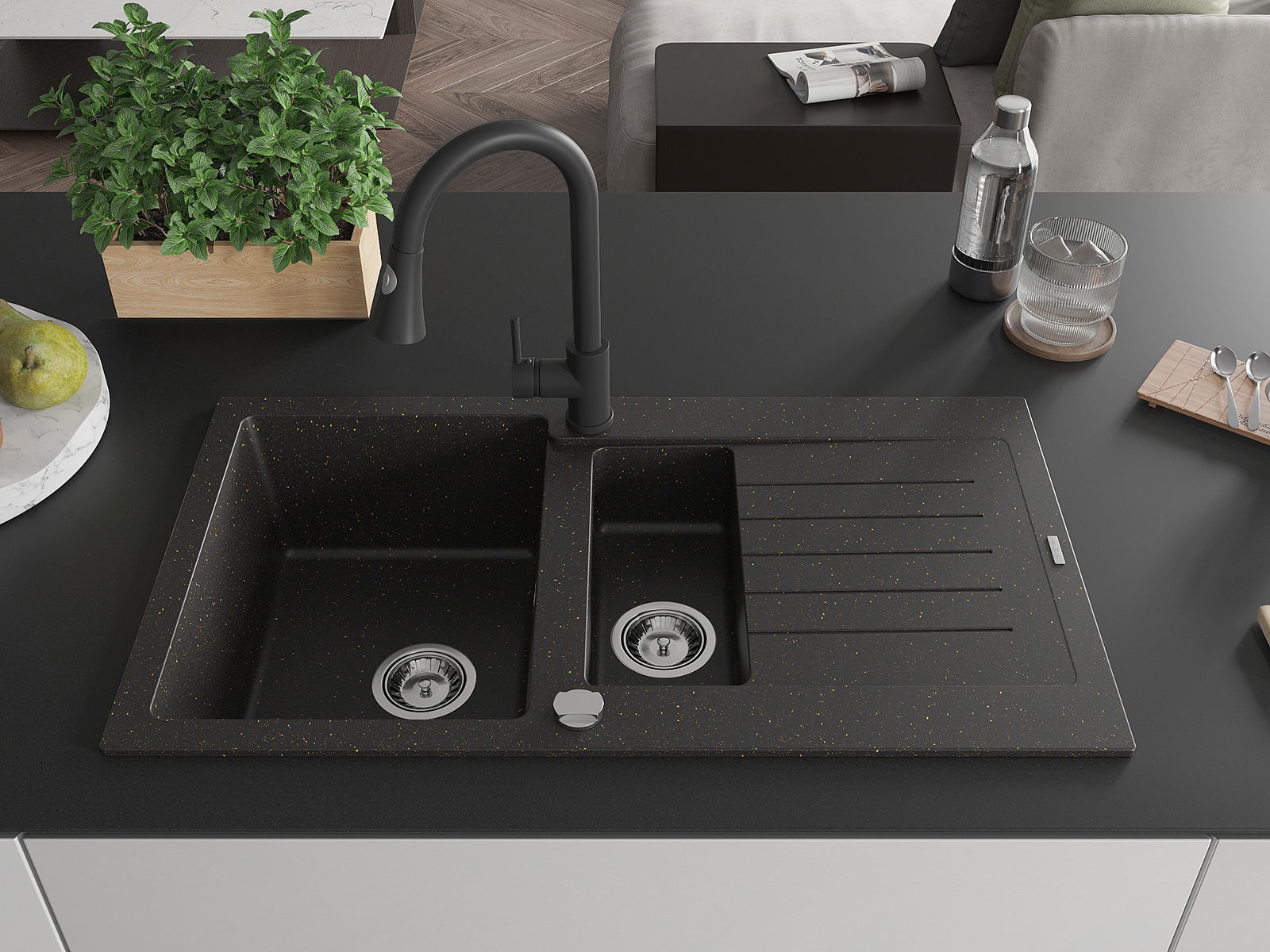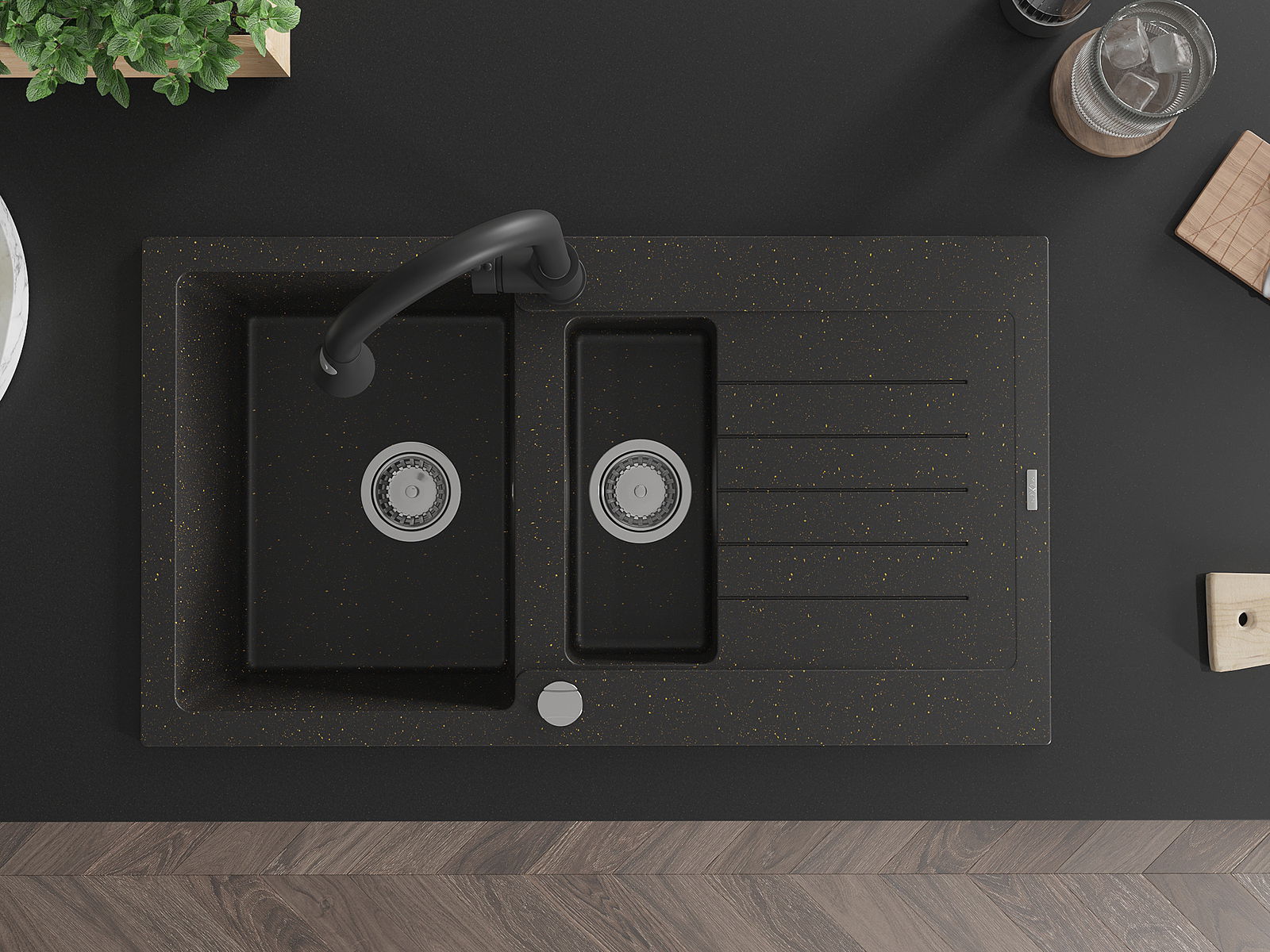 Mexen Matias 1,5 kamerų granito kriauklė su nutekėjimu ir virtuviniu maišytuvu Elia, juodos/auksinės metalo spalvos