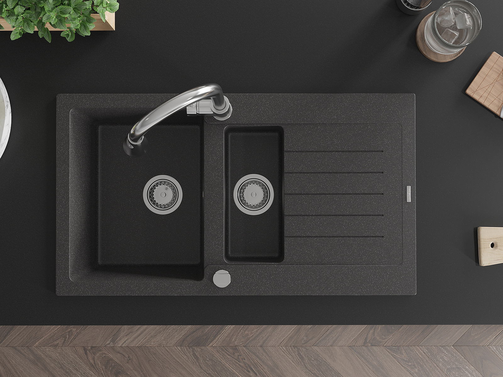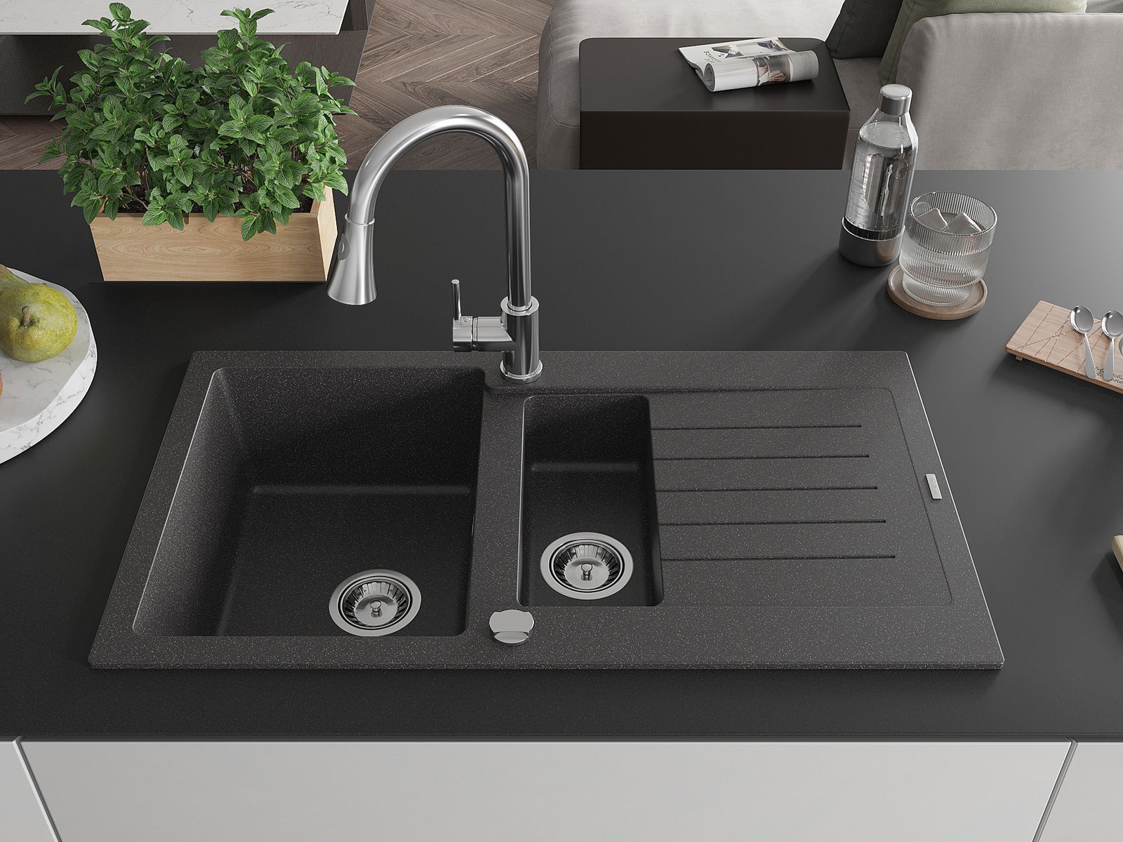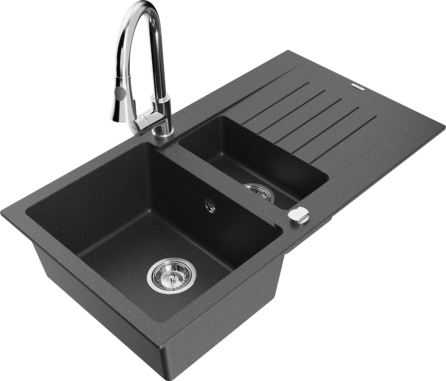 Mexen Matias granitinė 1,5 skylių kriauklė su drenažu ir Elia virtuviniu maišytuvu, juodas su dėmelėmis
