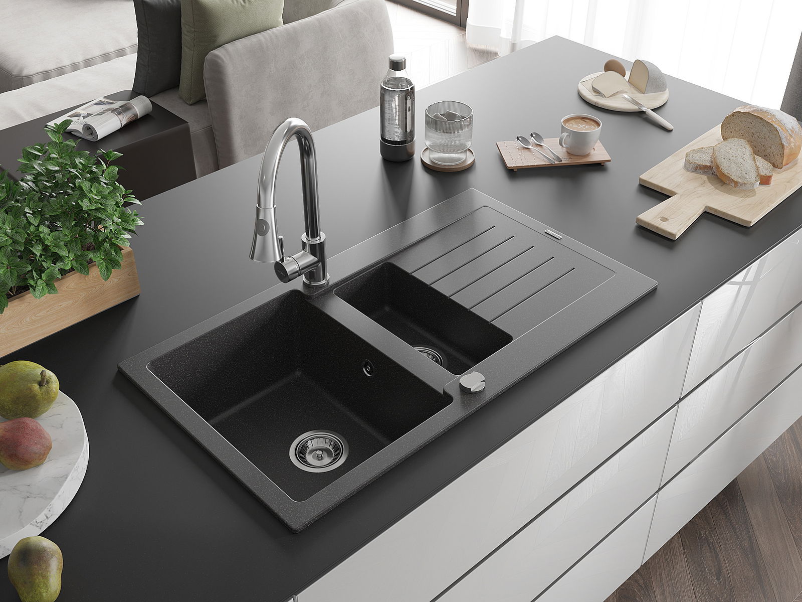 Kriauklė turi 2 iš anksto frezuotas skyles, kurių skersmuo yra 35 mm, skirtas savarankiškam išmušimui. Jas galima naudoti, pavyzdžiui, skysčio dozatoriaus montavimui, kuris pašalins plastikinių butelių buvimą virtuvėje ir suteiks jai elegantišką apdailą.