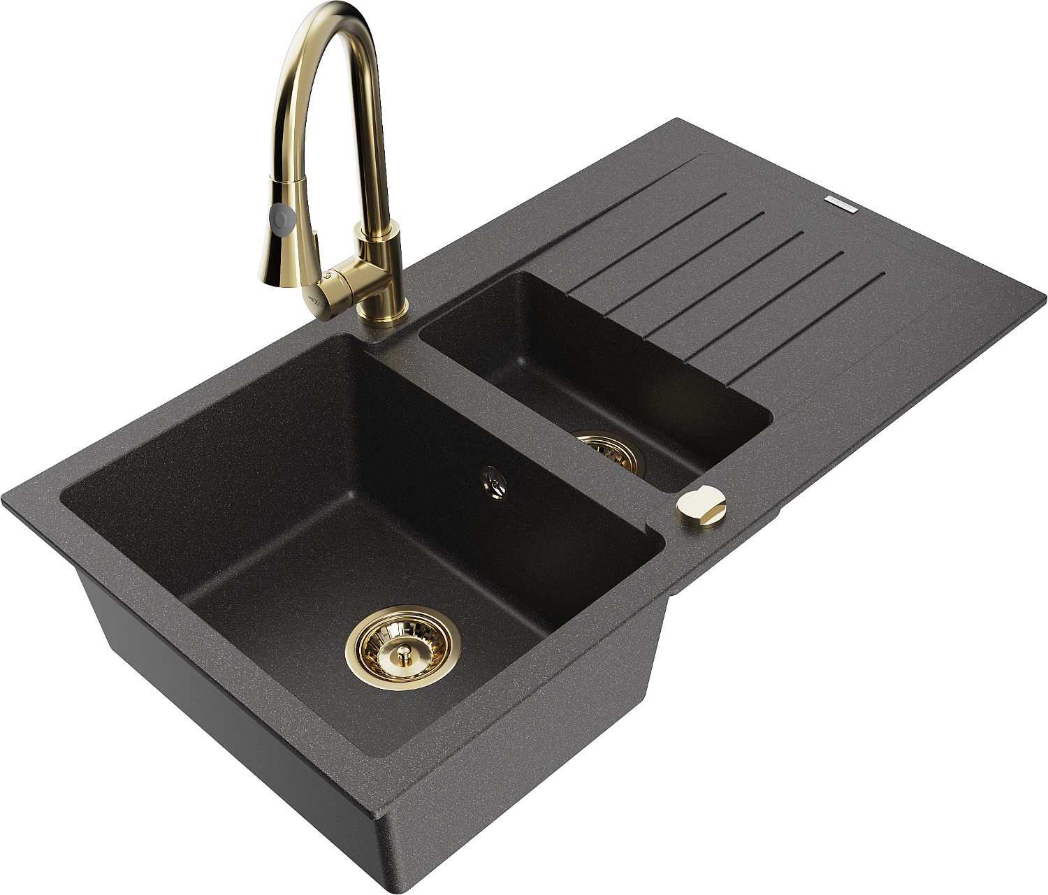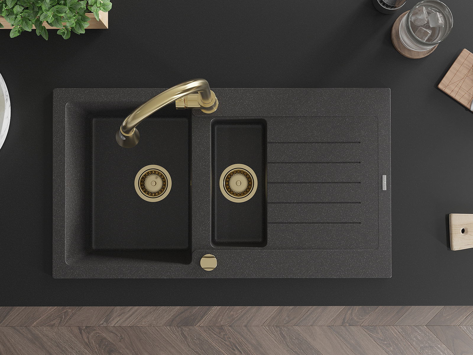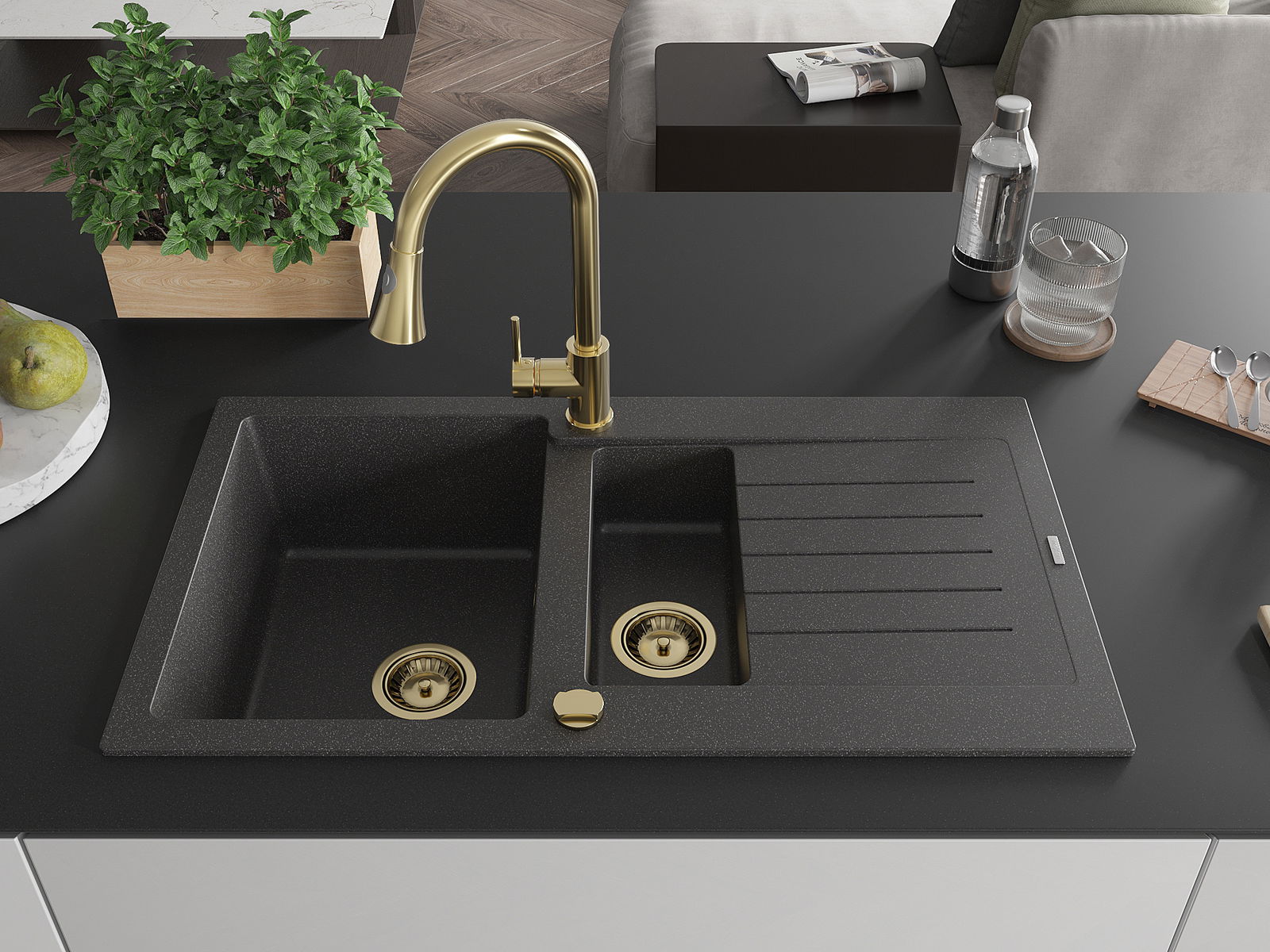 Mexen Matias 1,5 skyrių granitinė kriauklė su drenažu ir virtuviniu maišytuvu Elia, juoda su dėmėmis - 6502-76-670101-50