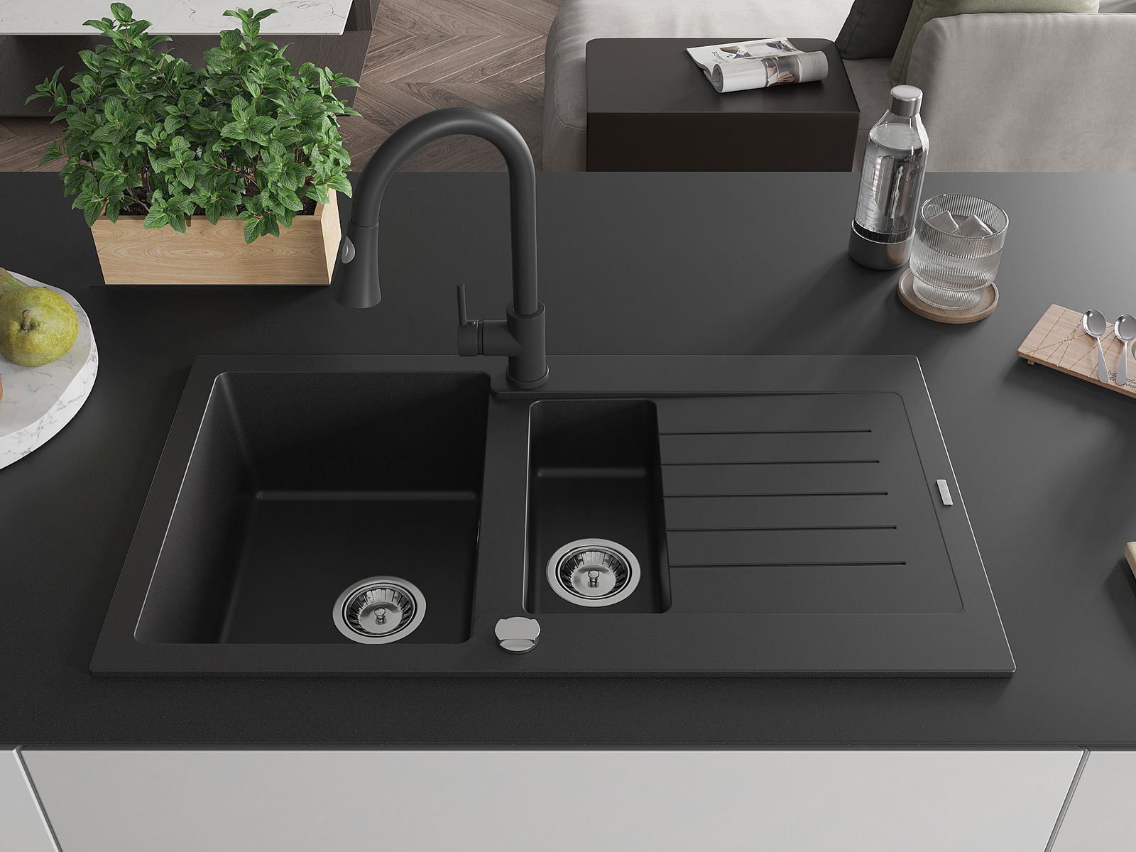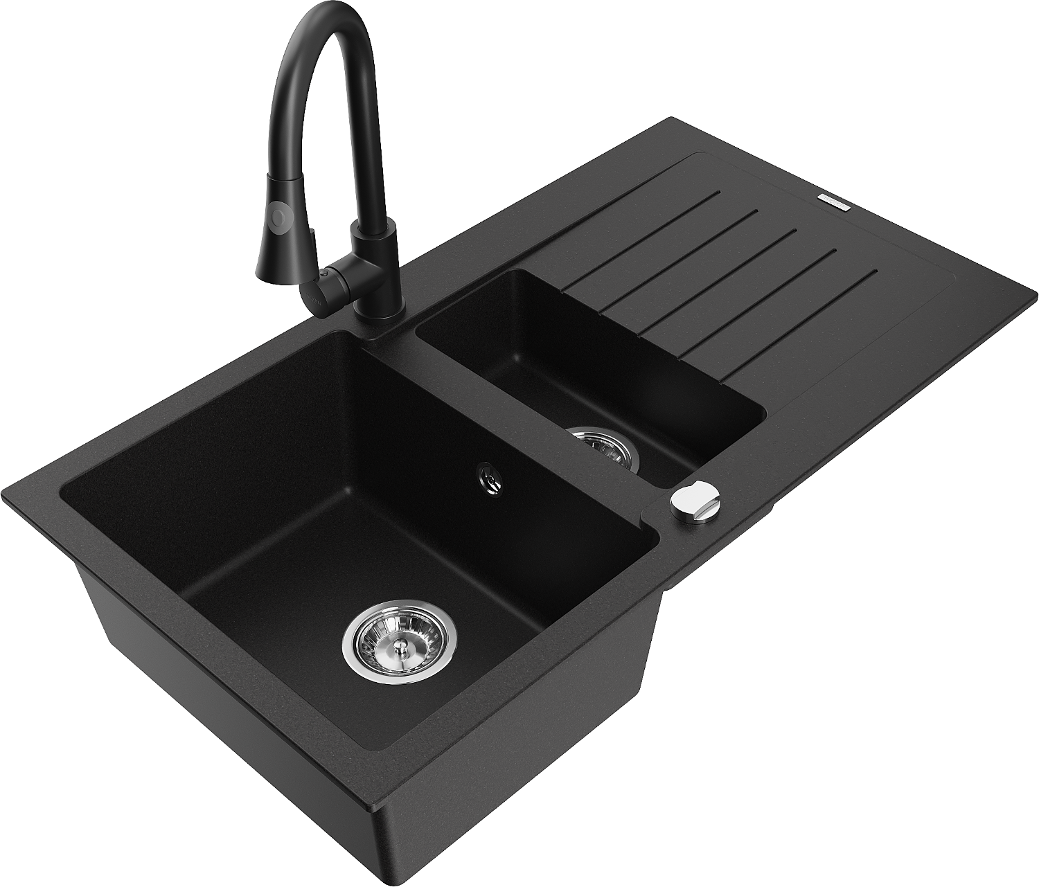 Mexen Matias granito virtuvės kriauklė 1,5 skirtukinė su nuotekų dalimi ir Elia virtuvės maišytuvu, juoda - 6502-77-670101-70