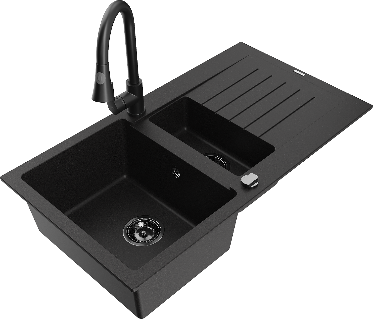 Mexen Matias granitinis plautuvės 1,5 skyrių su džiovykla ir virtuviniu maišytuvu Elia, juodas - 6502-77-670101-70-B