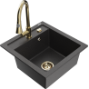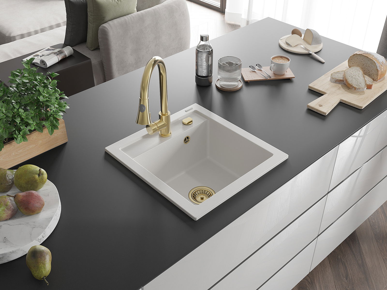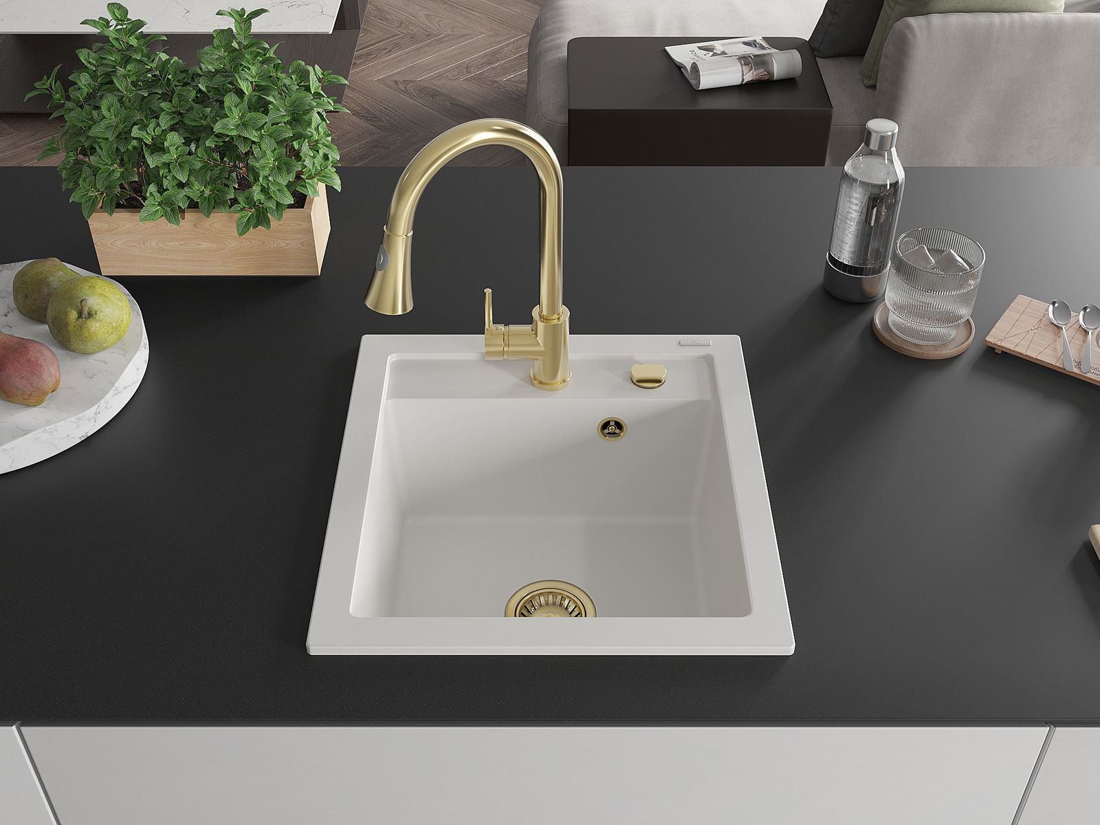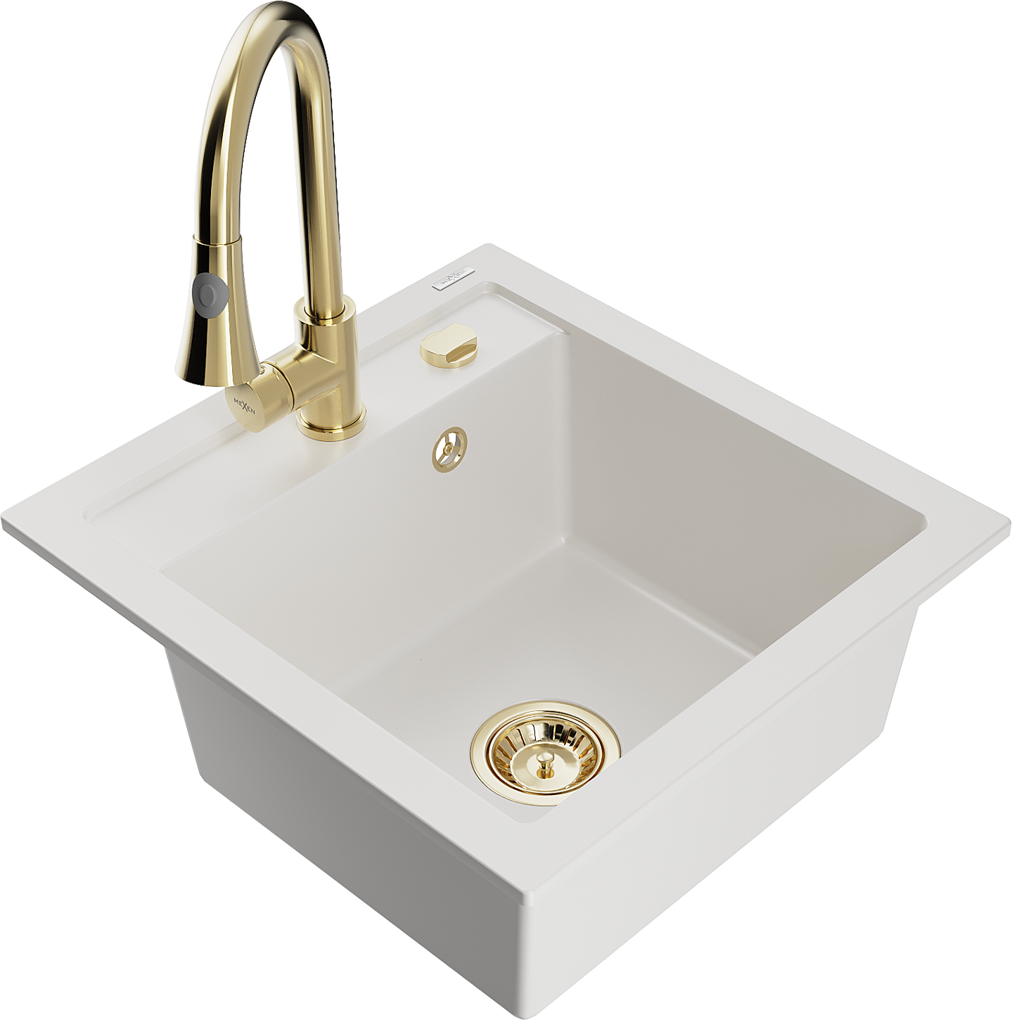 Mexen Vito granito virtuvės kriauklė 1 skyriumi su Elia virtuviniu maišytuvu, balta - 6503-20-670101-50