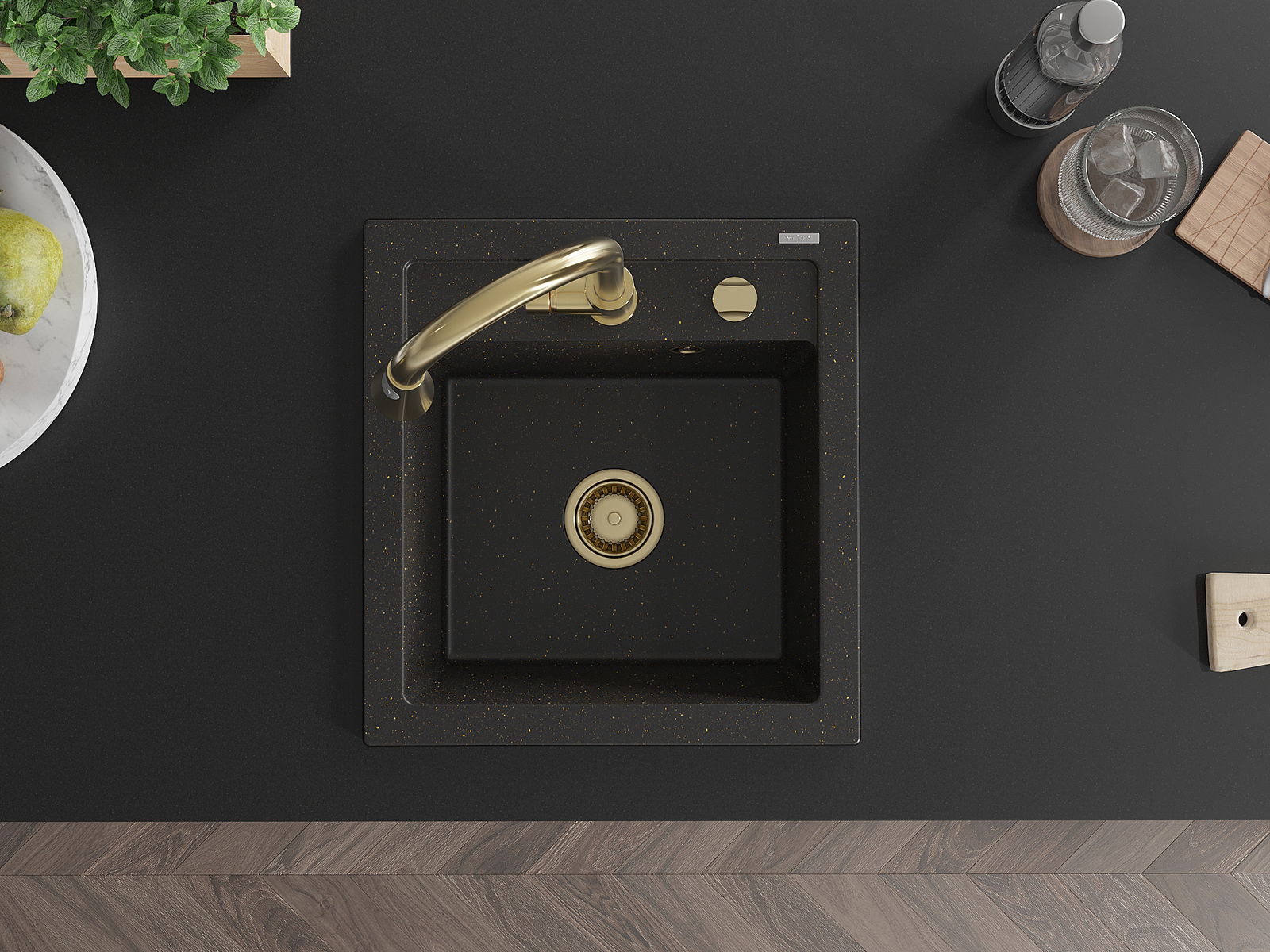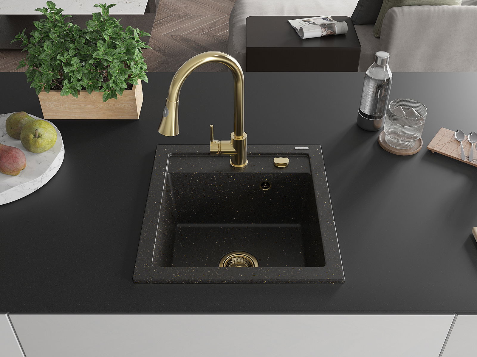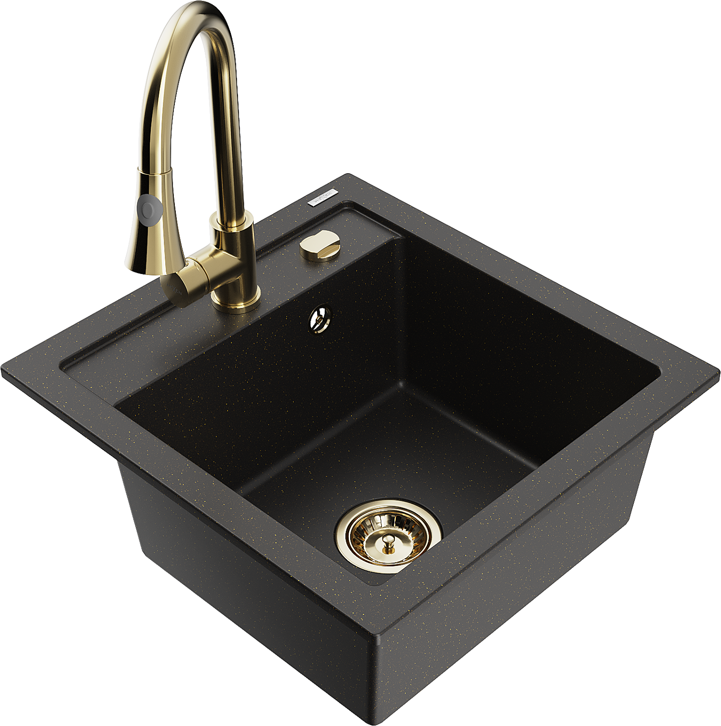 Mexen Vito vienos kameros granitinė plautuvė su virtuviniu maišytuvu Elia, juoda/auksinis metalikas - 6503-75-670101-50