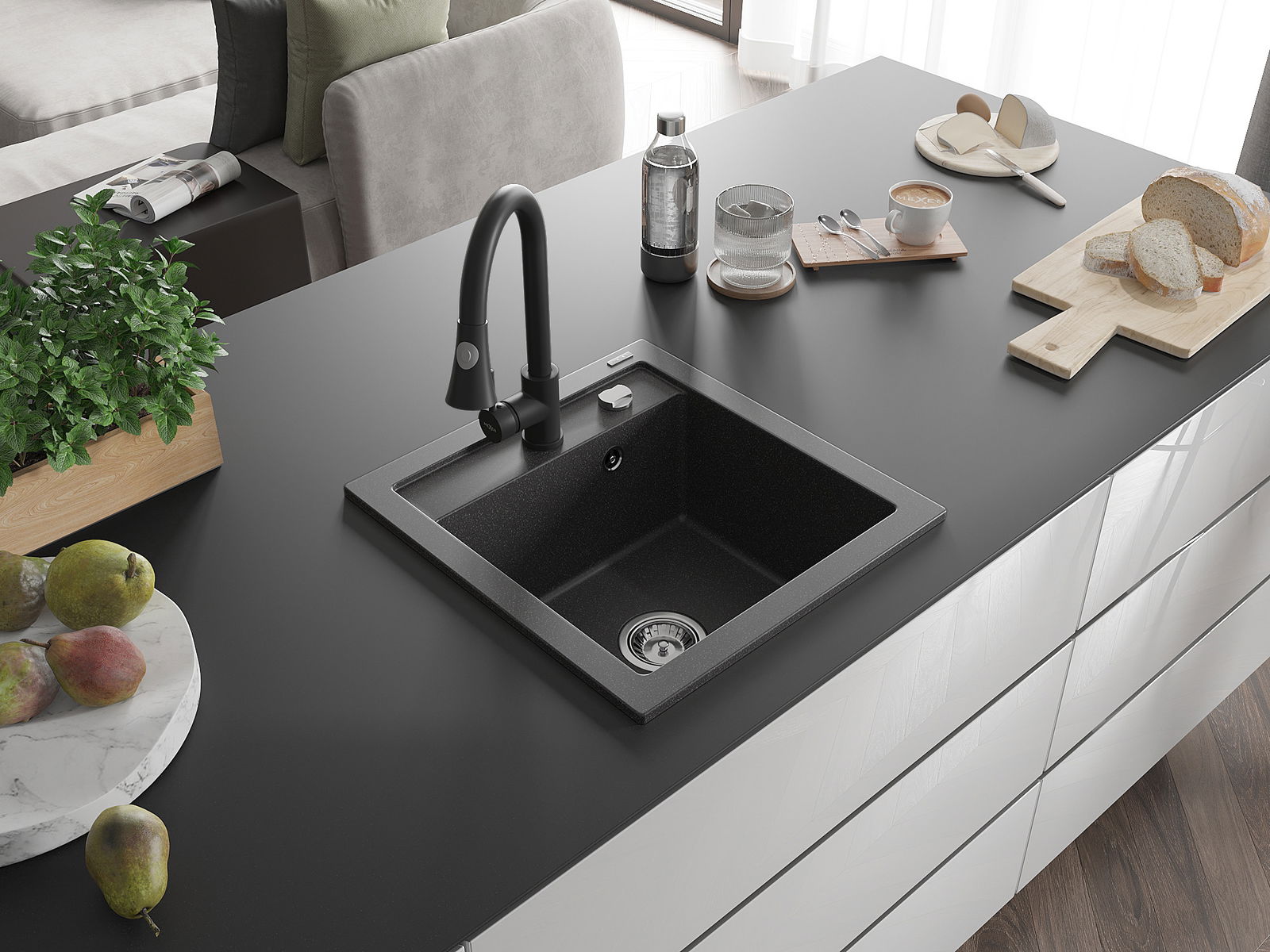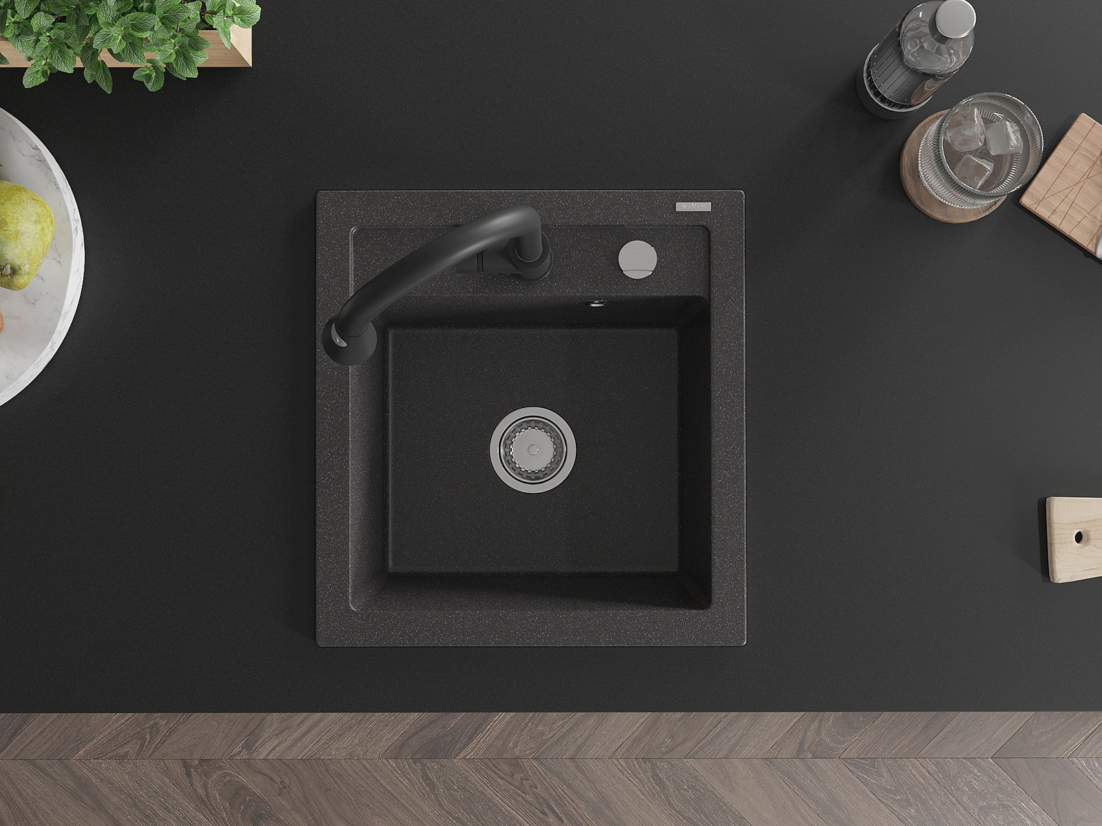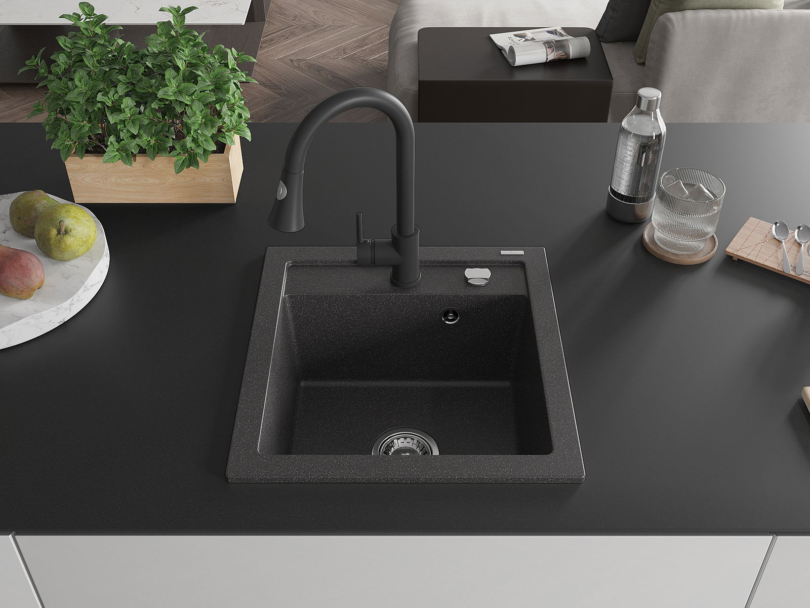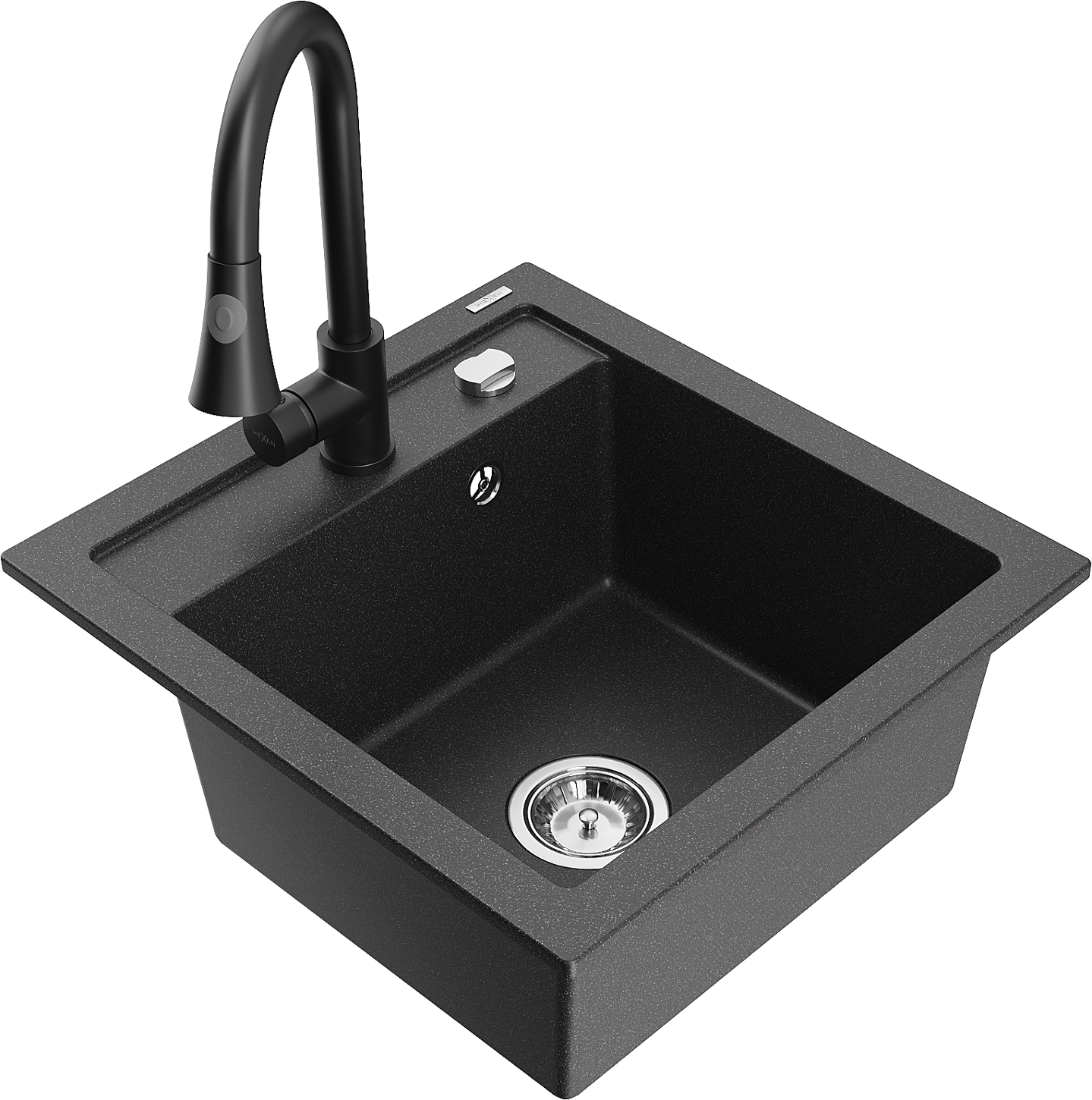 Mexen Vito granito kriauklė su viena kamera ir virtuvės maišytuvu Elia, juodas taškuotas - 6503-76-670101-70