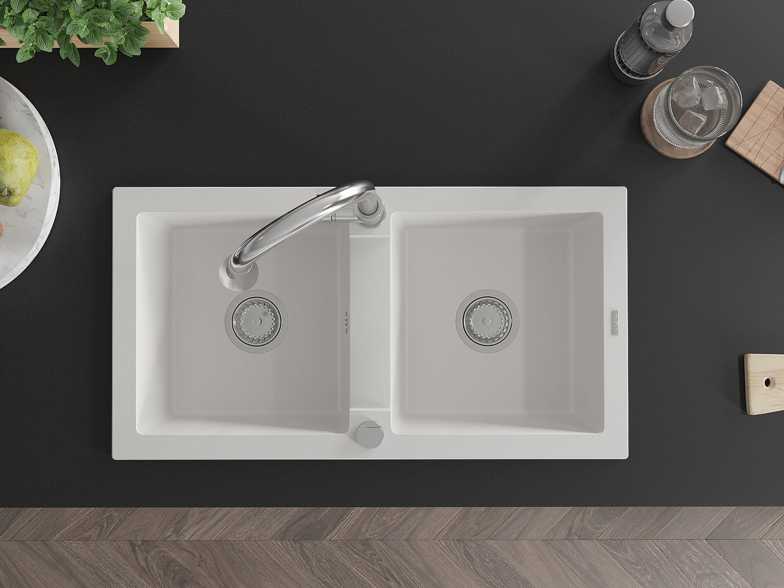 Mexen Mario granitinis plautuvės 2 skyrių su Elia virtuviniu maišytuvu, baltas - 6504-20-670101-00
