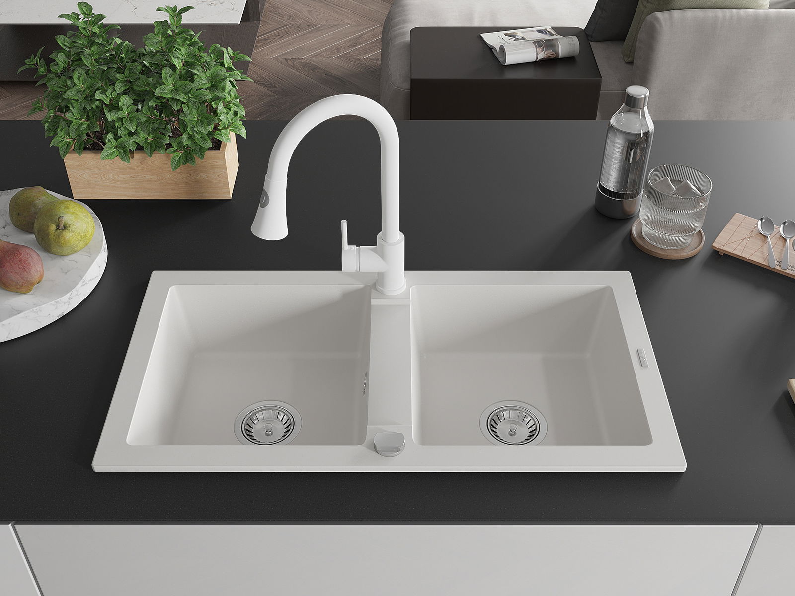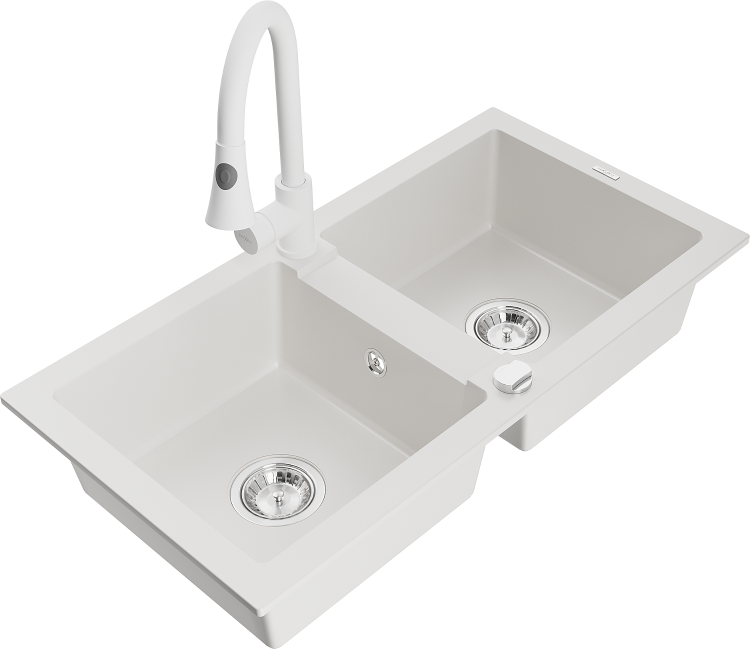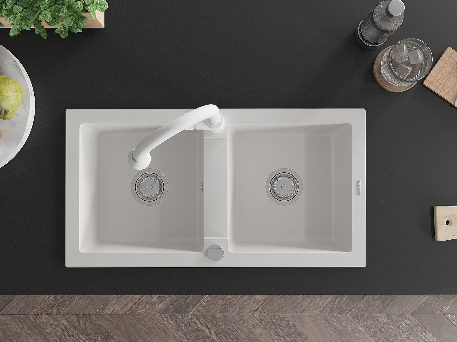 Mexen Mario granito kriauklė su 2 kameromis ir virtuviniu maišytuvu Elia, baltas - 6504-20-670101-20