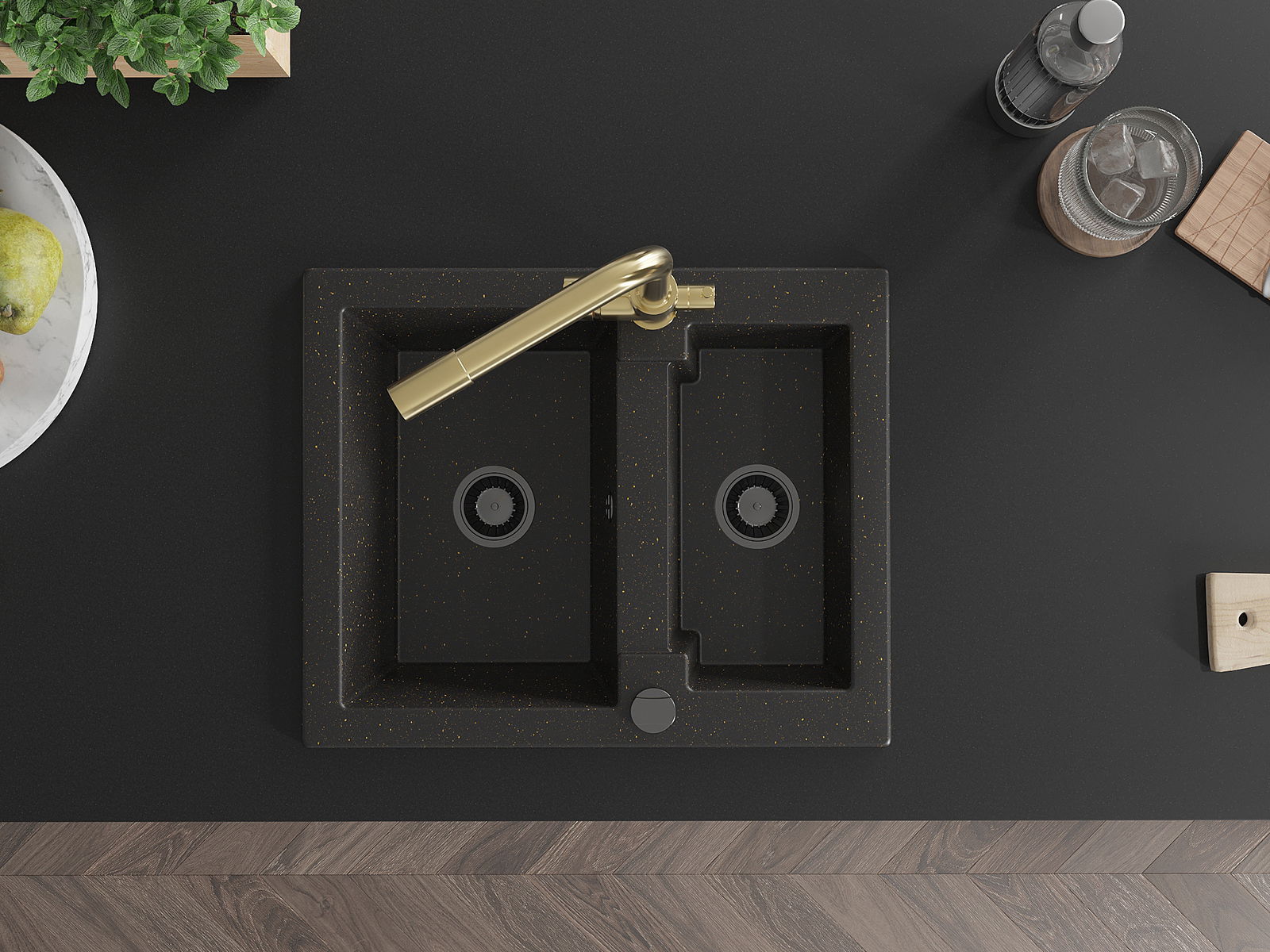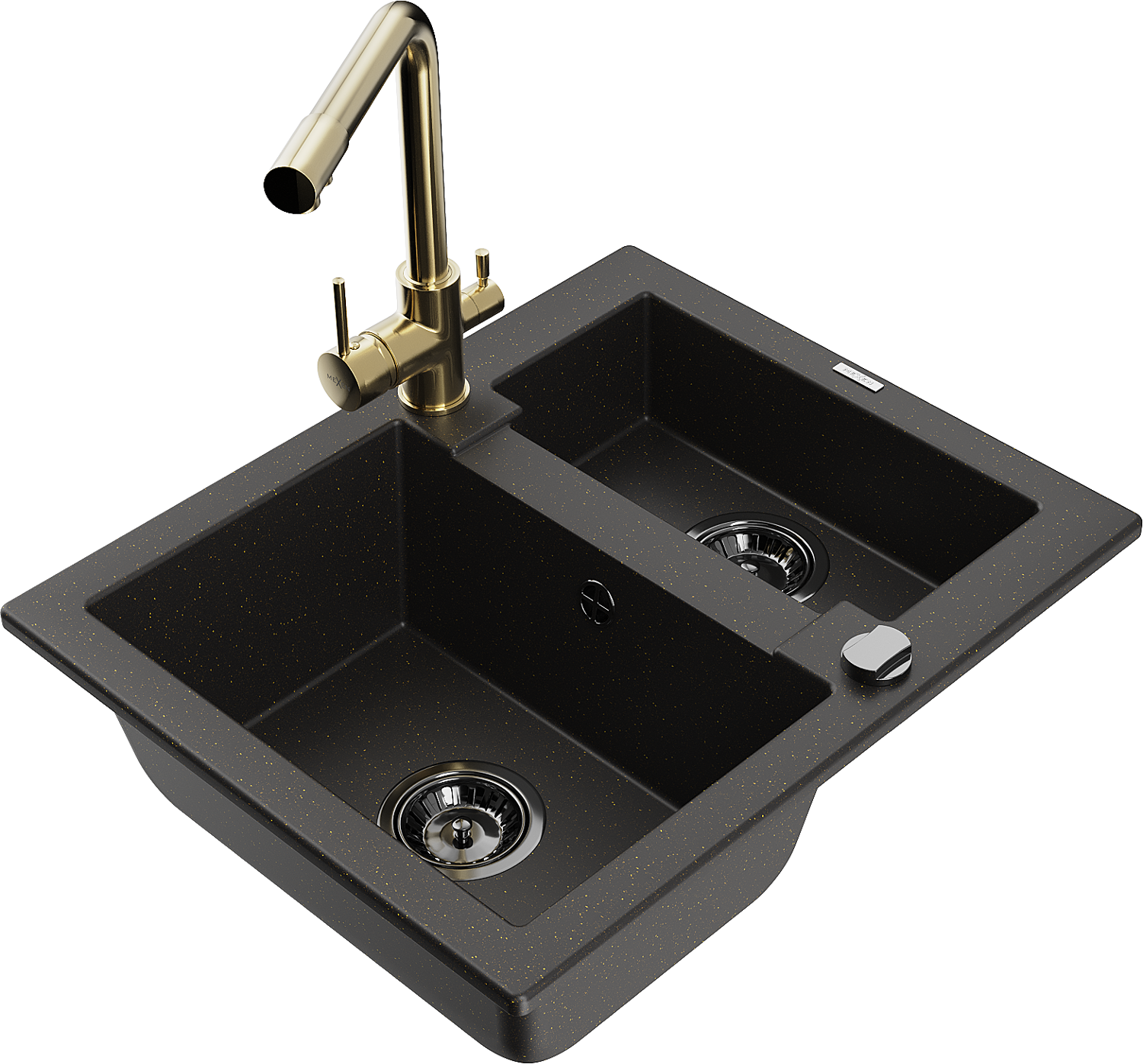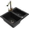 Mexen Carlos granitinė 1,5 skylių plautuvė su Duero virtuviniu maišytuvu, juoda/auksinės metalo spalvos - 6518-75-671600-50-B
