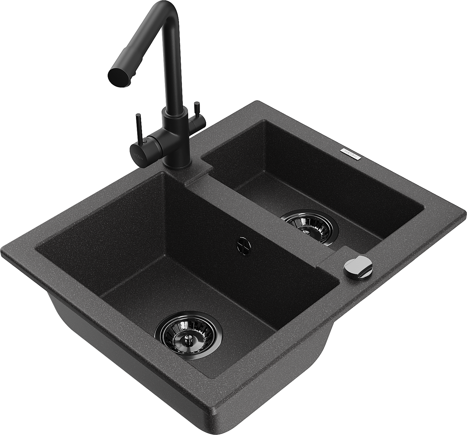 Mexen Carlos granito kriauklė 1,5 skylių su virtuviniu maišytuvu Duero, juoda dėmėta - 6518-76-671600-70-B