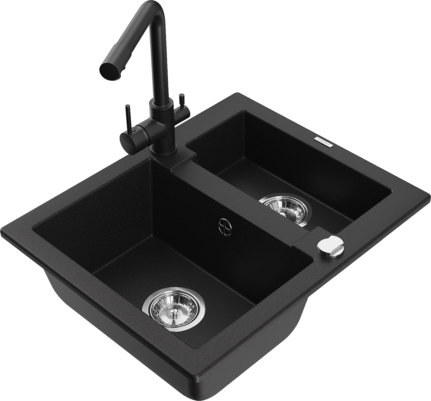 Mexen Carlos granitinė 1,5 kamerų kriauklė su virtuviniu maišytuvu Duero, juoda - 6518-77-671600-70