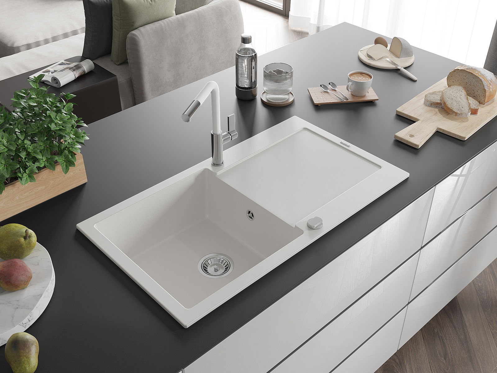 Mexen Leo granito plautuvė vienos dėžės, su drenažu ir Flora virtuvės maišytuvu, balta - 6501-20-670401-02