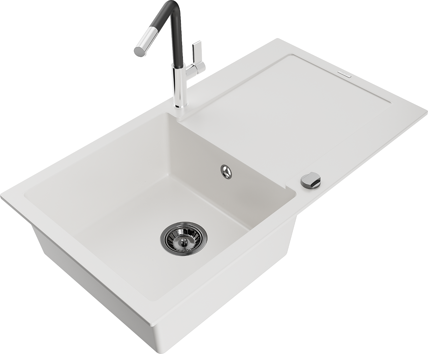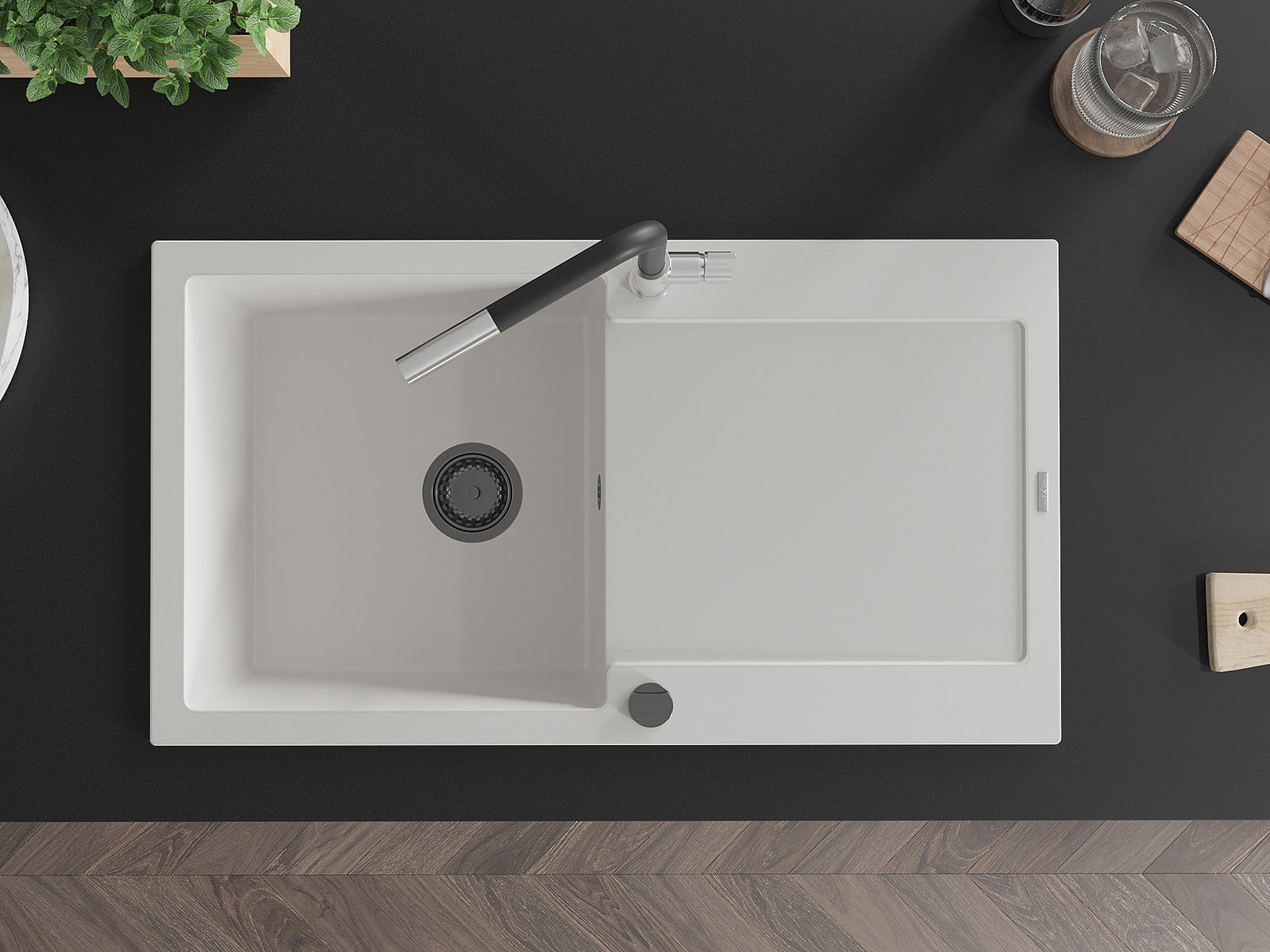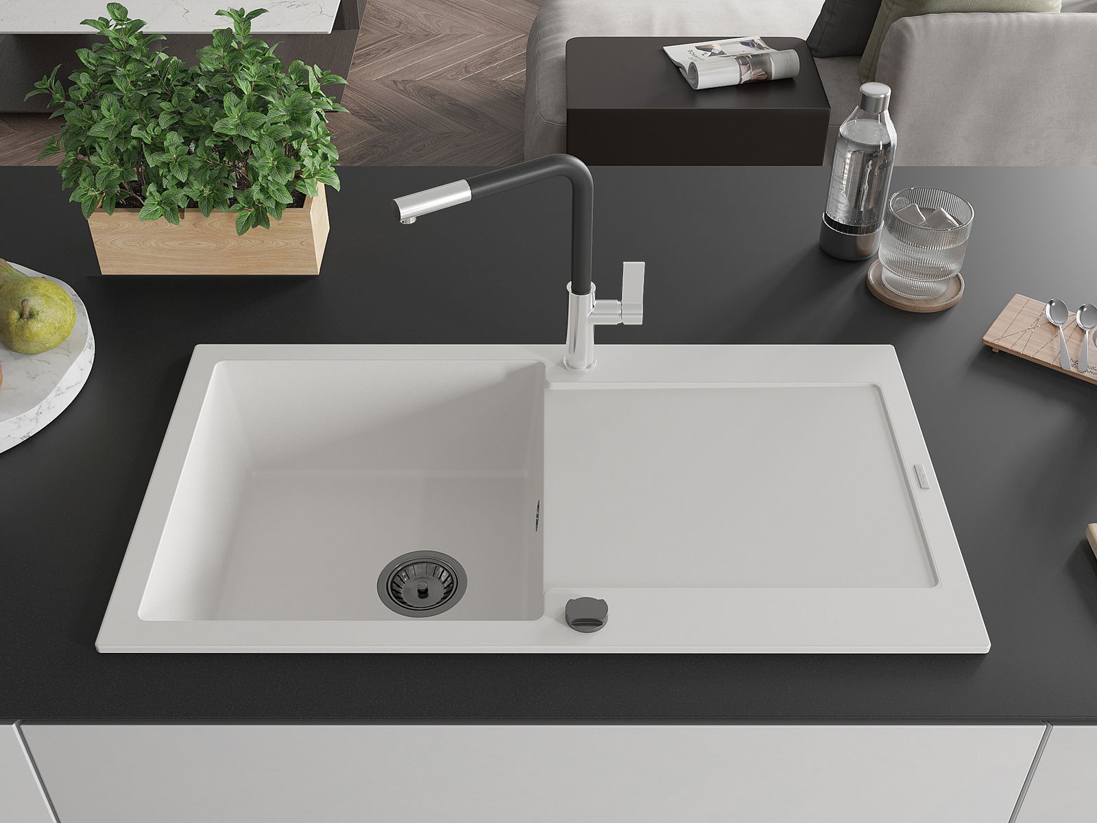 Mexen Leo granitinis plautuvė 1-skyrius su nusausintuvu ir virtuviniu maišytuvu Flora, baltas - 6501-20-670401-07-B