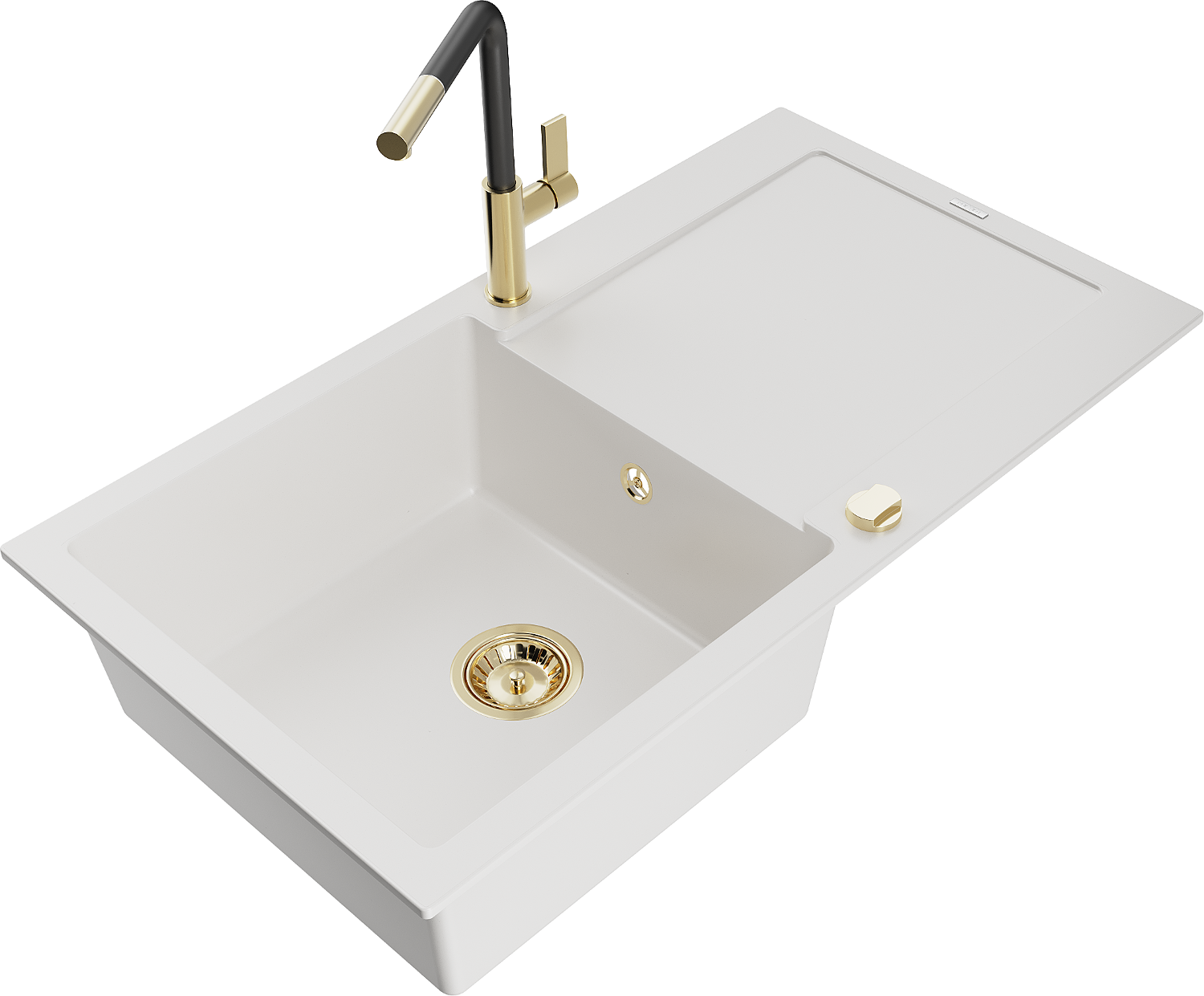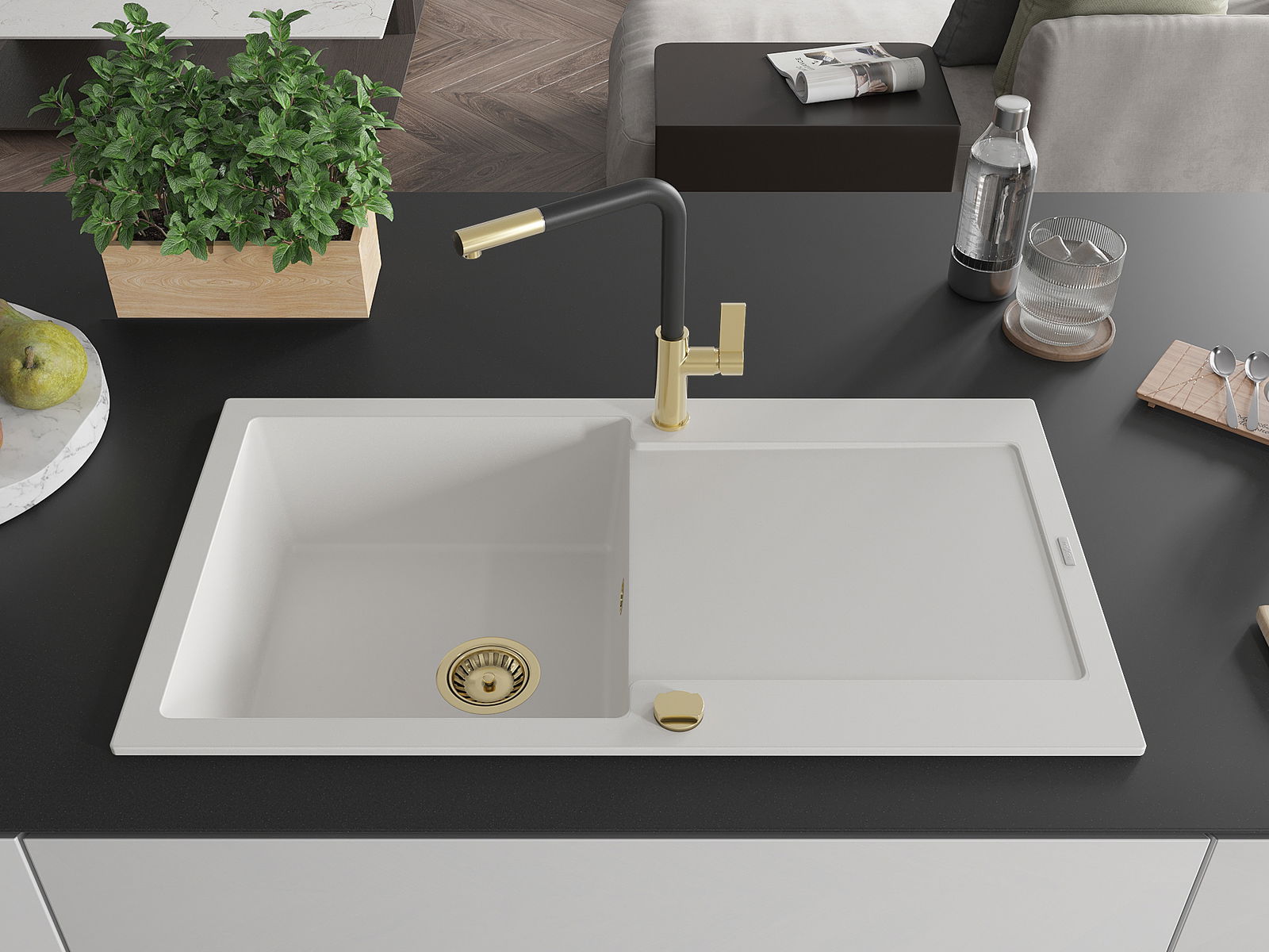 Mexen Leo vienkamerinė granito virtuvės kriauklė su nusausintuvu ir virtuvės maišytuvu Flora, balta - 6501-20-670401-57-G