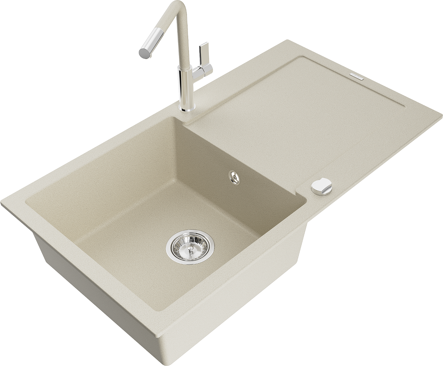 Mexen Leo granitinė vienos kameros plautuvė su nusausintuvu ir Flora virtuvės maišytuvu, smėlio spalvos - 6501-69-670401-09