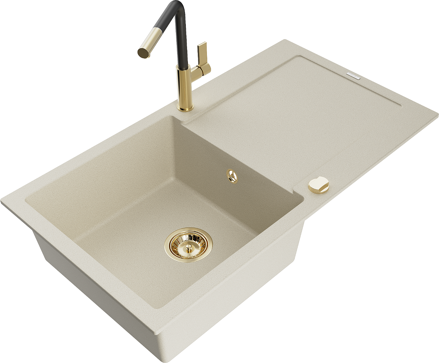 Mexen Leo granitinė virtuvinė kriauklė su viena kamera, nusausintuvu ir Flora virtuviniu maišytuvu, smėlio - 6501-69-670401-57-?