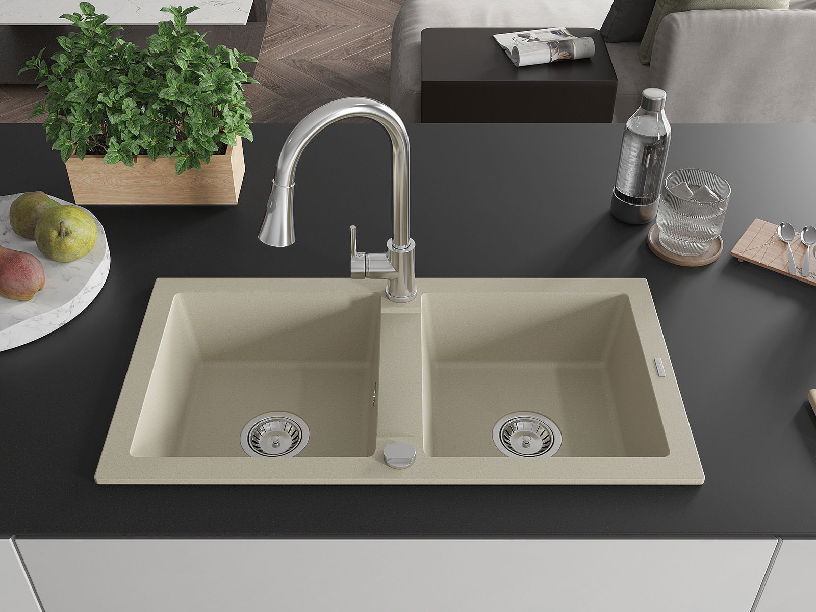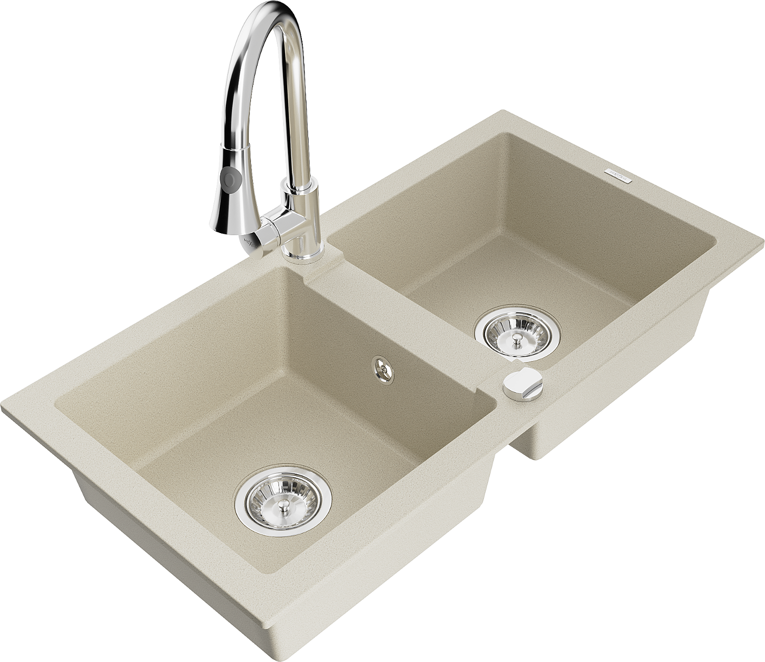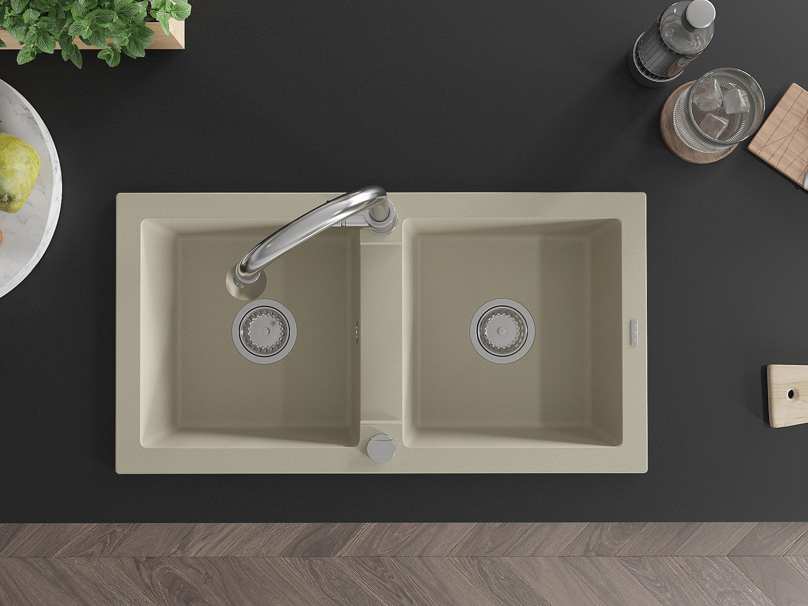 Mexen Mario granitinis dviejų skyrių virtuvės kriauklė su maišytuvu Elia, smėlinė - 6504-69-670101-00
