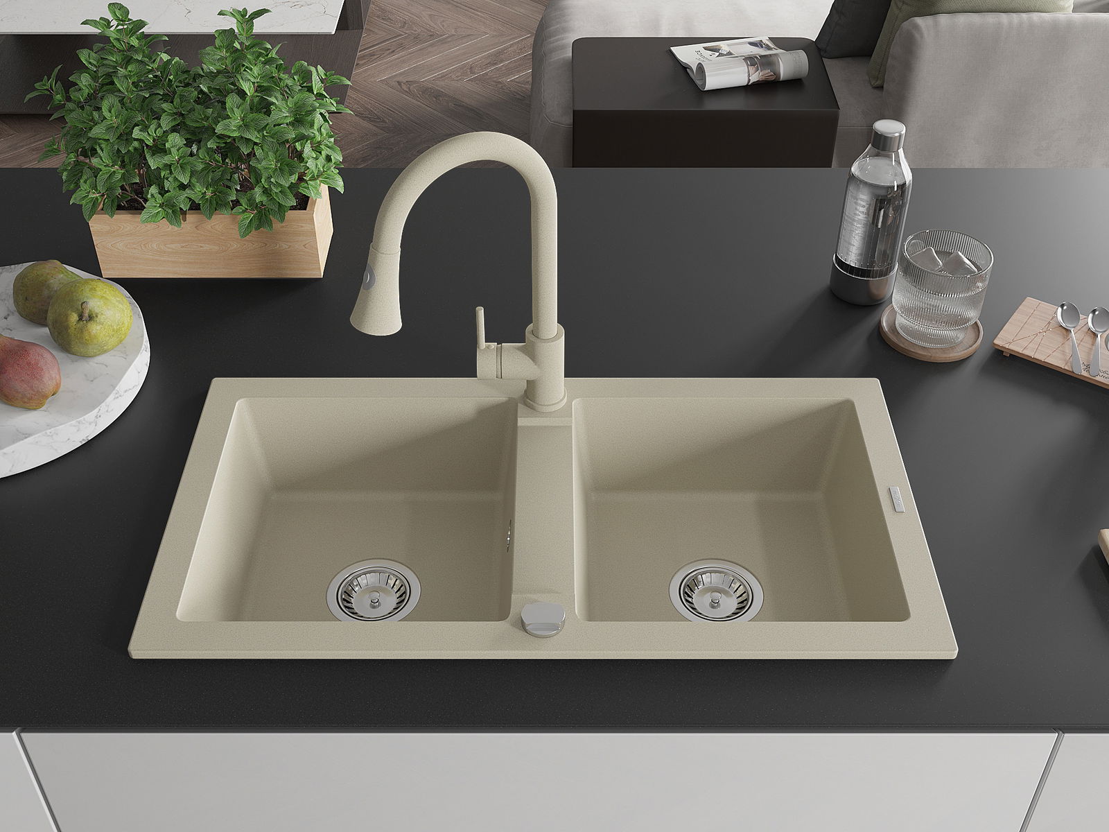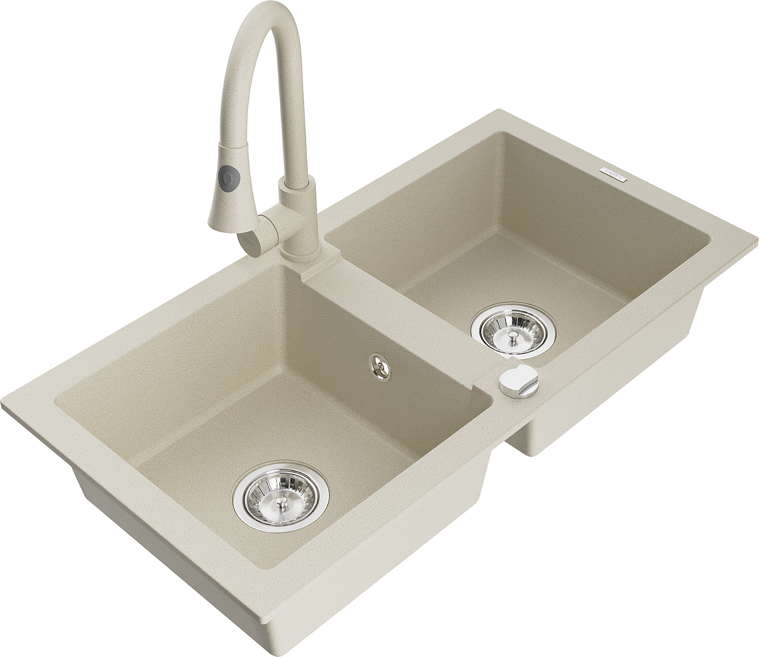 Mexen Mario granitinis dviejų kamerų kriauklė su virtuvės maišytuvu Elia, smėlio - 6504-69-670101-69