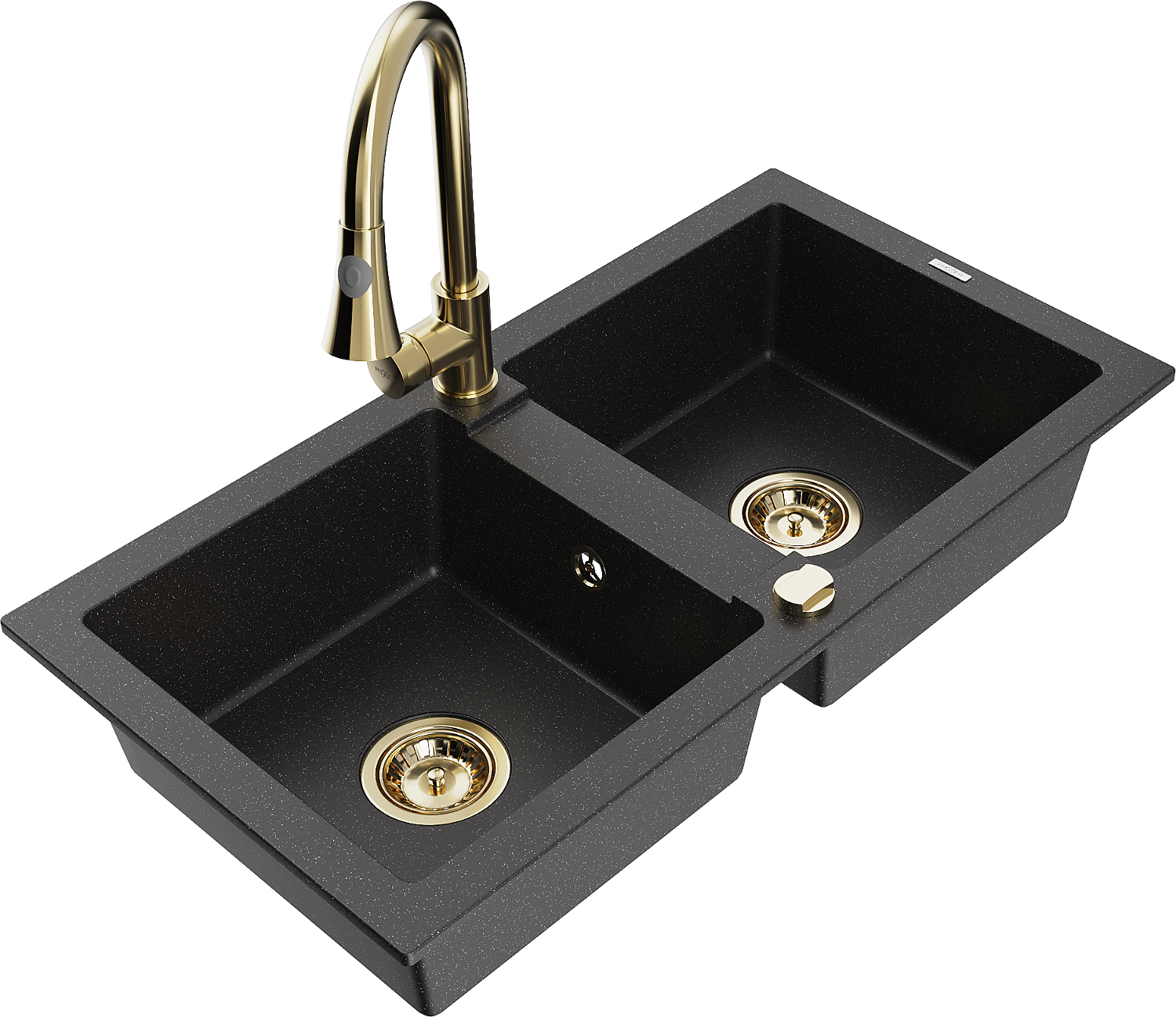 Mexen Mario granitinis dviejų dubenų plautuvė su virtuviniu maišytuvu Elia, juoda/sidabro metalo spalva - 6504-73-670101-50