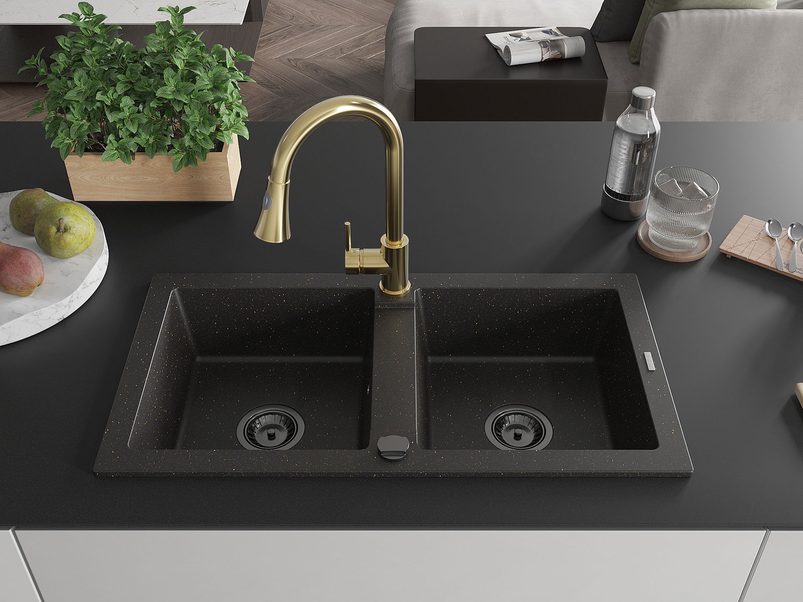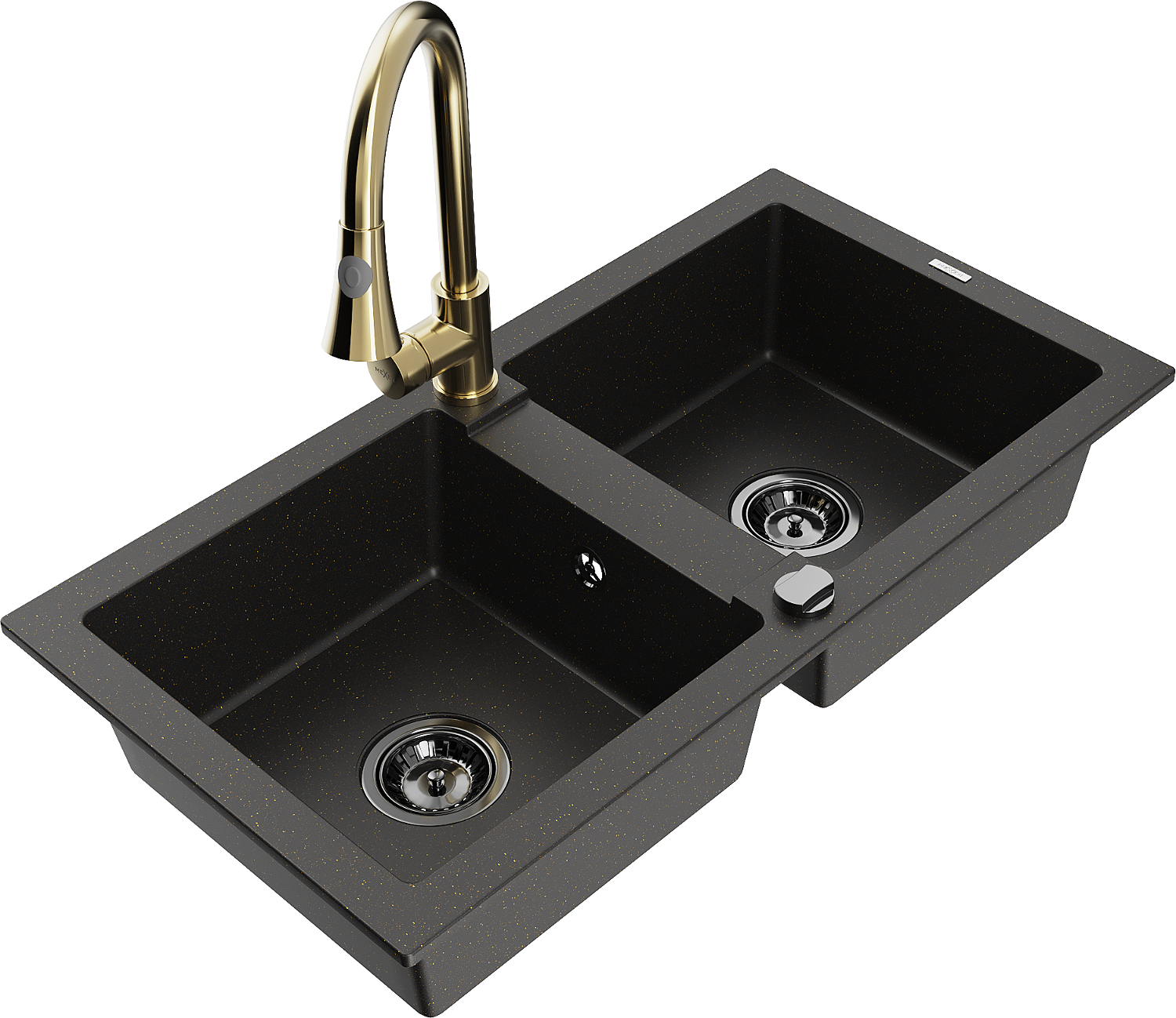 Mexen Mario granito plautuvė su 2 kameromis ir virtuviniu maišytuvu Elia, juoda/auksinė metalika - 6504-75-670101-50-B