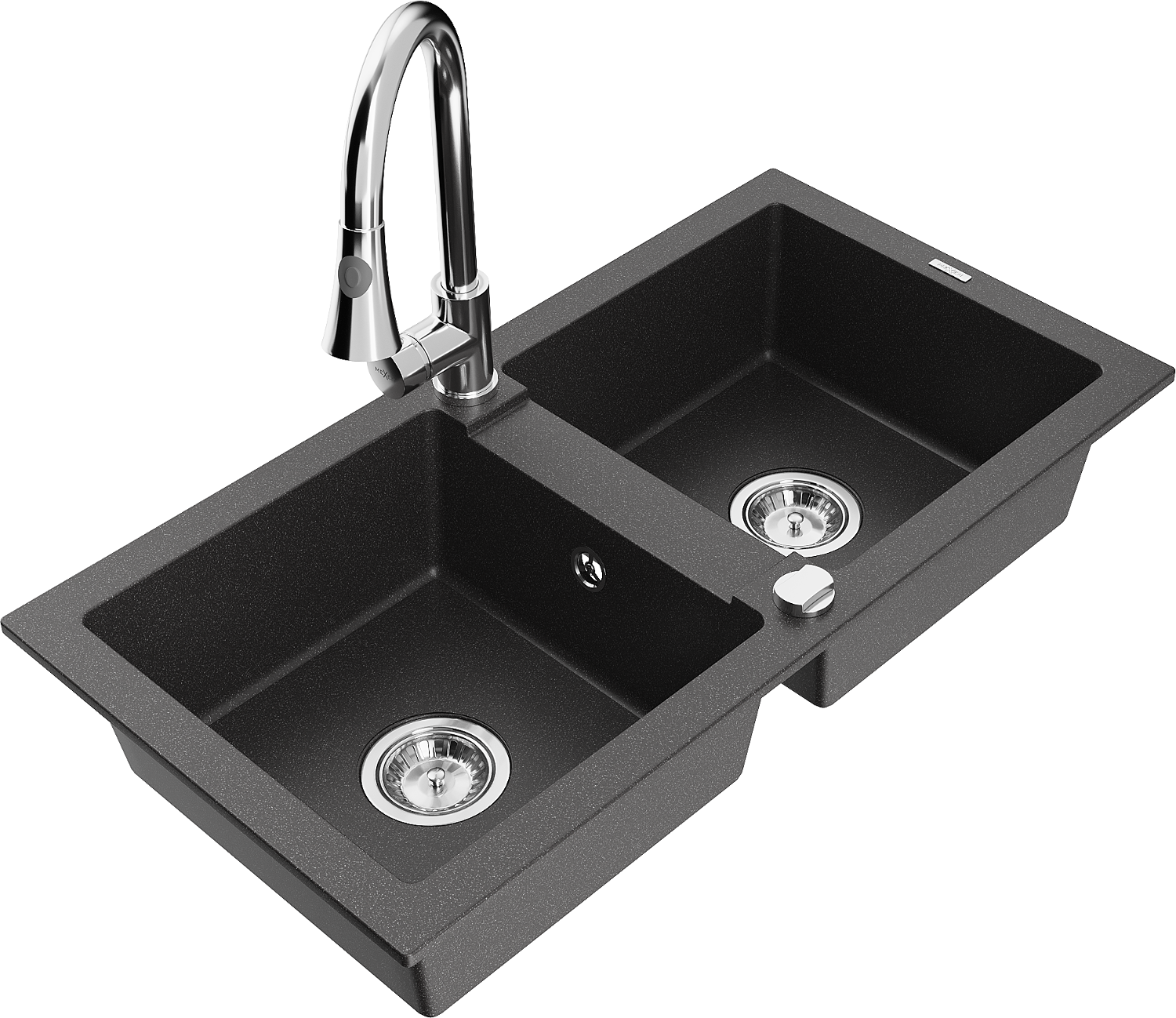 Mexen Mario dviejų skyrių granitinė plautuvė su virtuviniu maišytuvu Elia, juoda dėmėta - 6504-76-670101-00