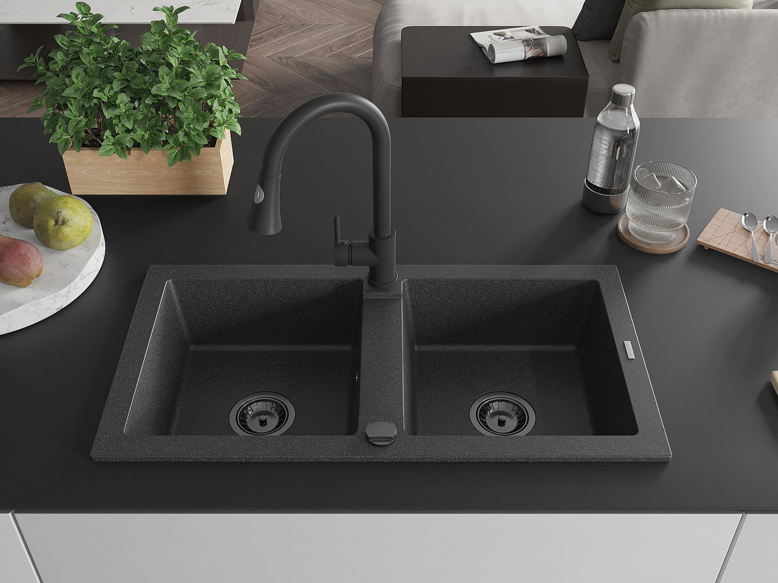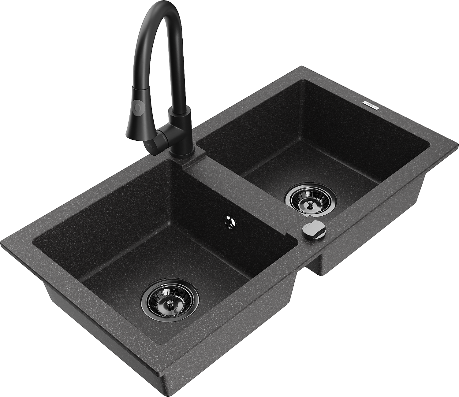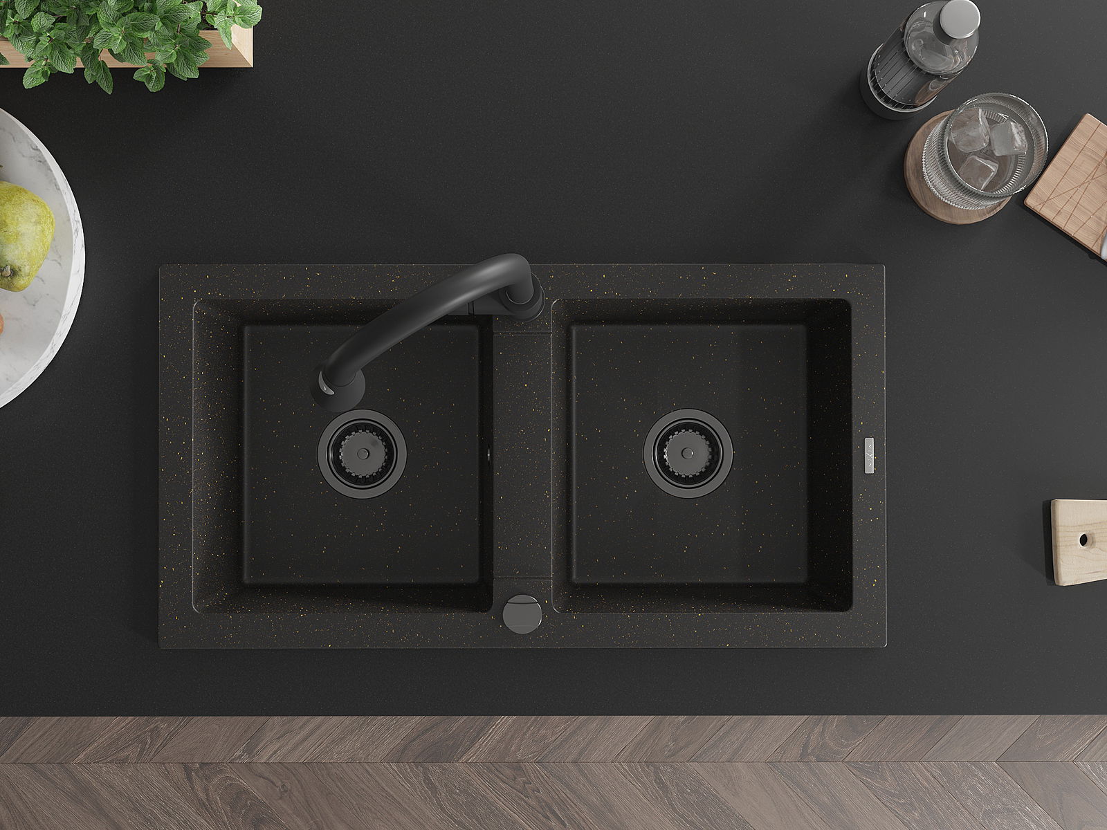 Mexen Mario akmeninis dviejų skyrių kriauklė su virtuviniu maišytuvu Elia, juoda su taškeliais - 6504-76-670101-70-B