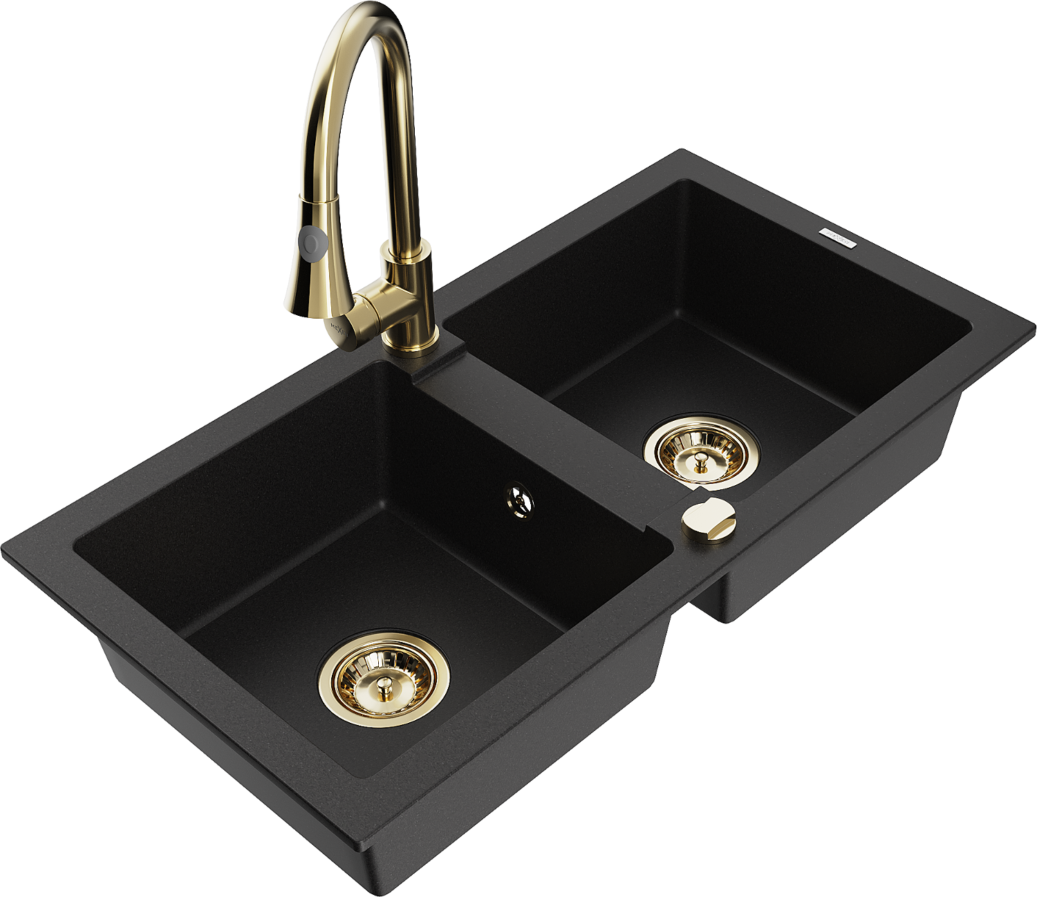 Mexen Mario granito kriauklė 2 skylių su virtuvės maišytuvu Elia, juoda - 6504-77-670101-50