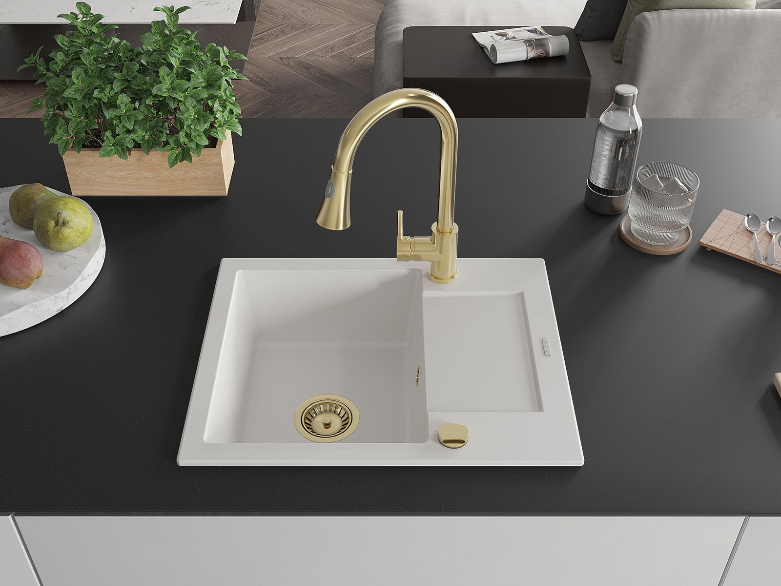 Mexen Enzo granitinė kriauklė su nuvarvėjimo zona ir virtuviniu maišytuvu Elia, balta - 6506-20-670101-50