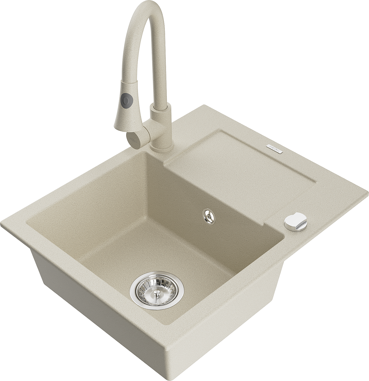 Mexen Enzo vienos kameros granito kriauklė su nutekėjimu ir Elia virtuviniu maišytuvu, smėlio spalvos - 6506-69-670101-69