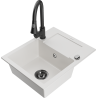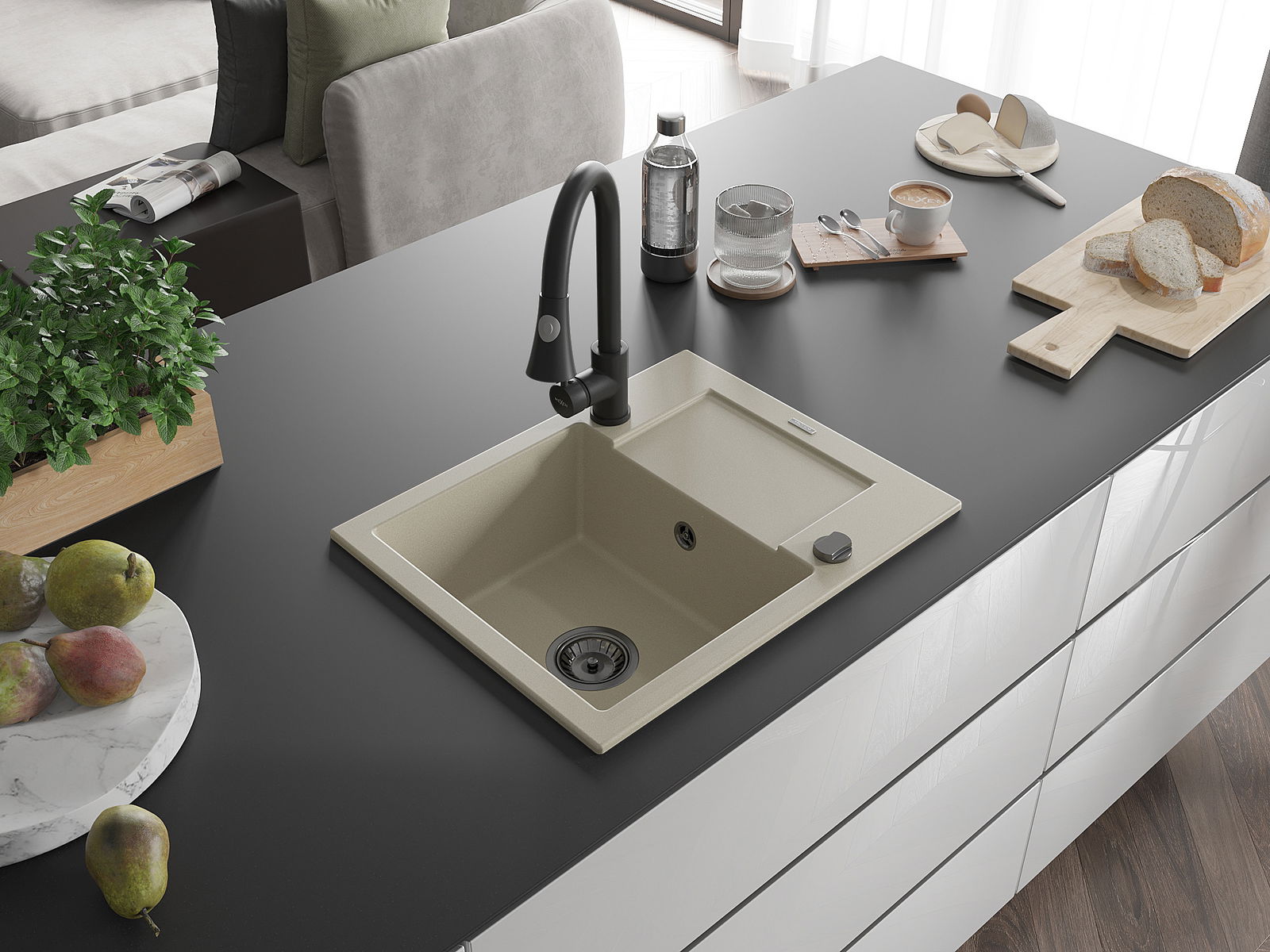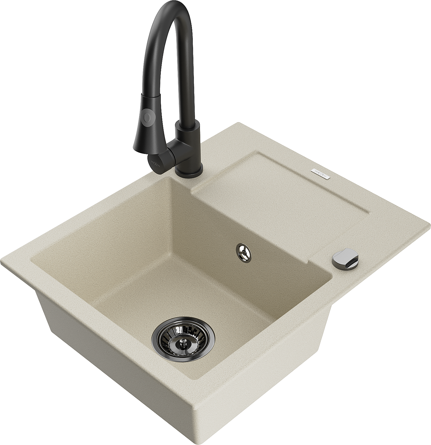 Mexen Enzo vieno dubens granitinė kriauklė su nusausinimo lentele ir virtuviniu maišytuvu Elia, smėlio spalvos