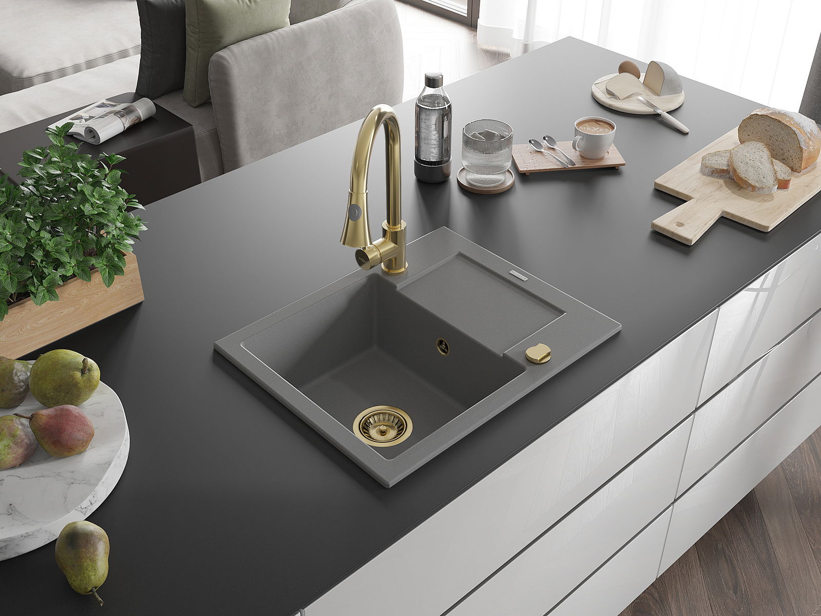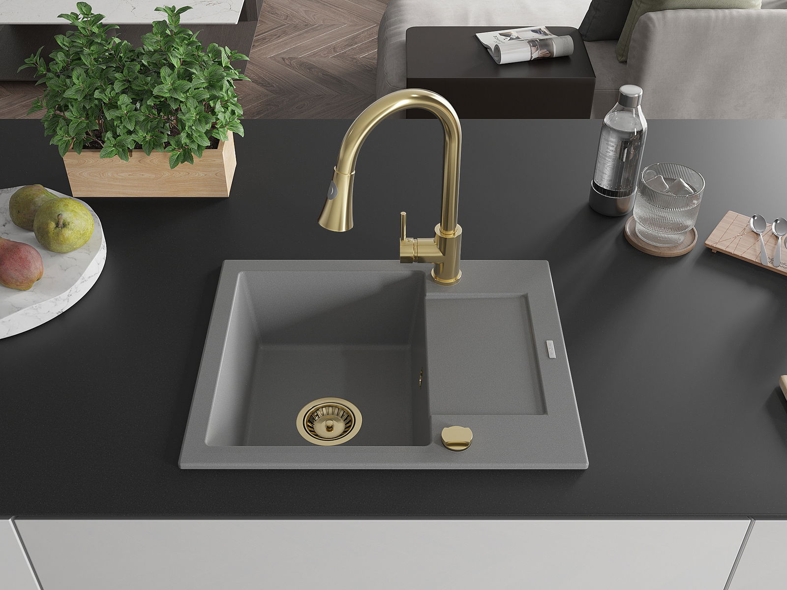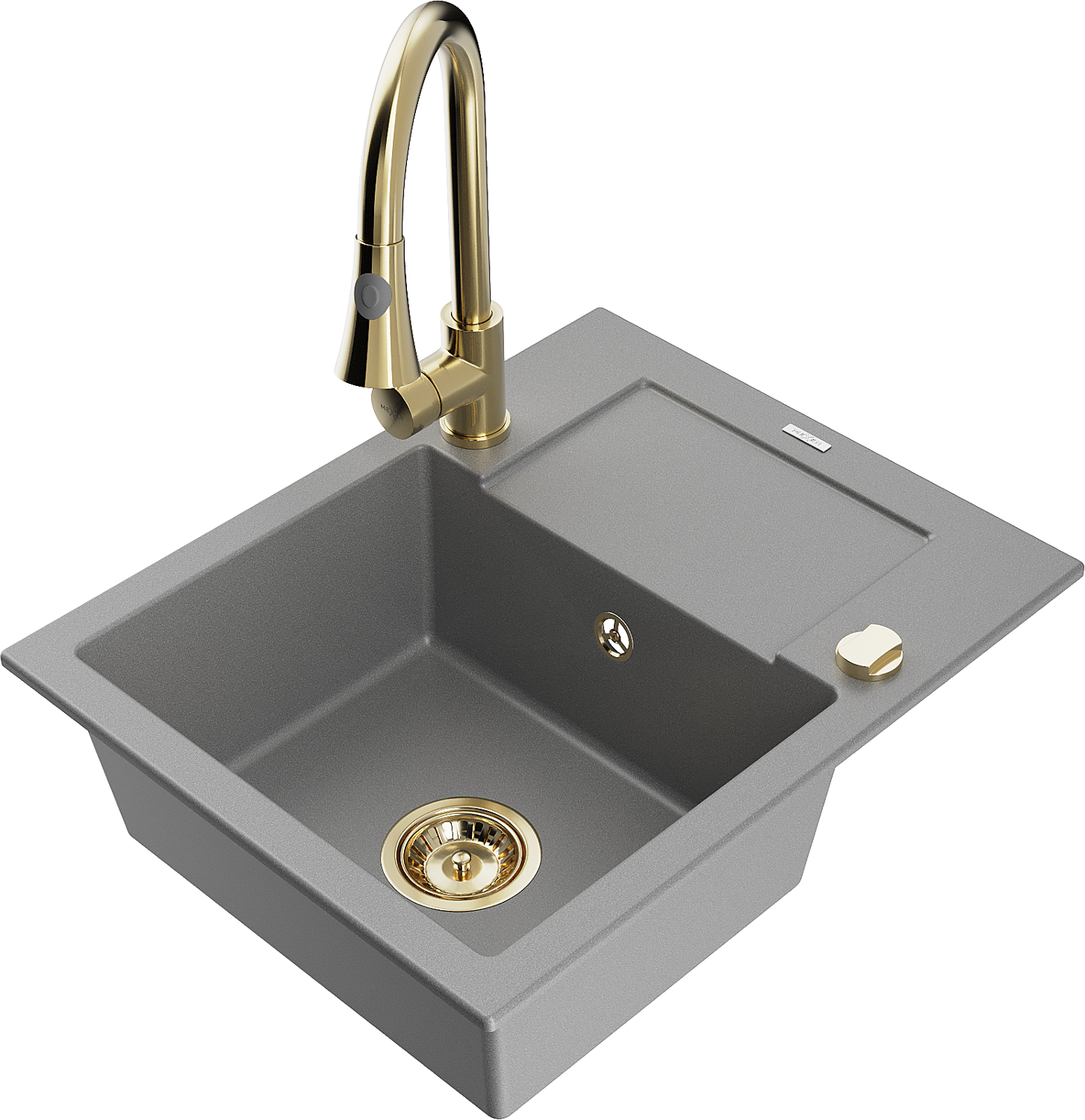 Mexen Enzo vienos dubens granitinė kriauklė su nusausinimo plokšte ir virtuviniu maišytuvu Elia, pilka - 6506-71-670101-50