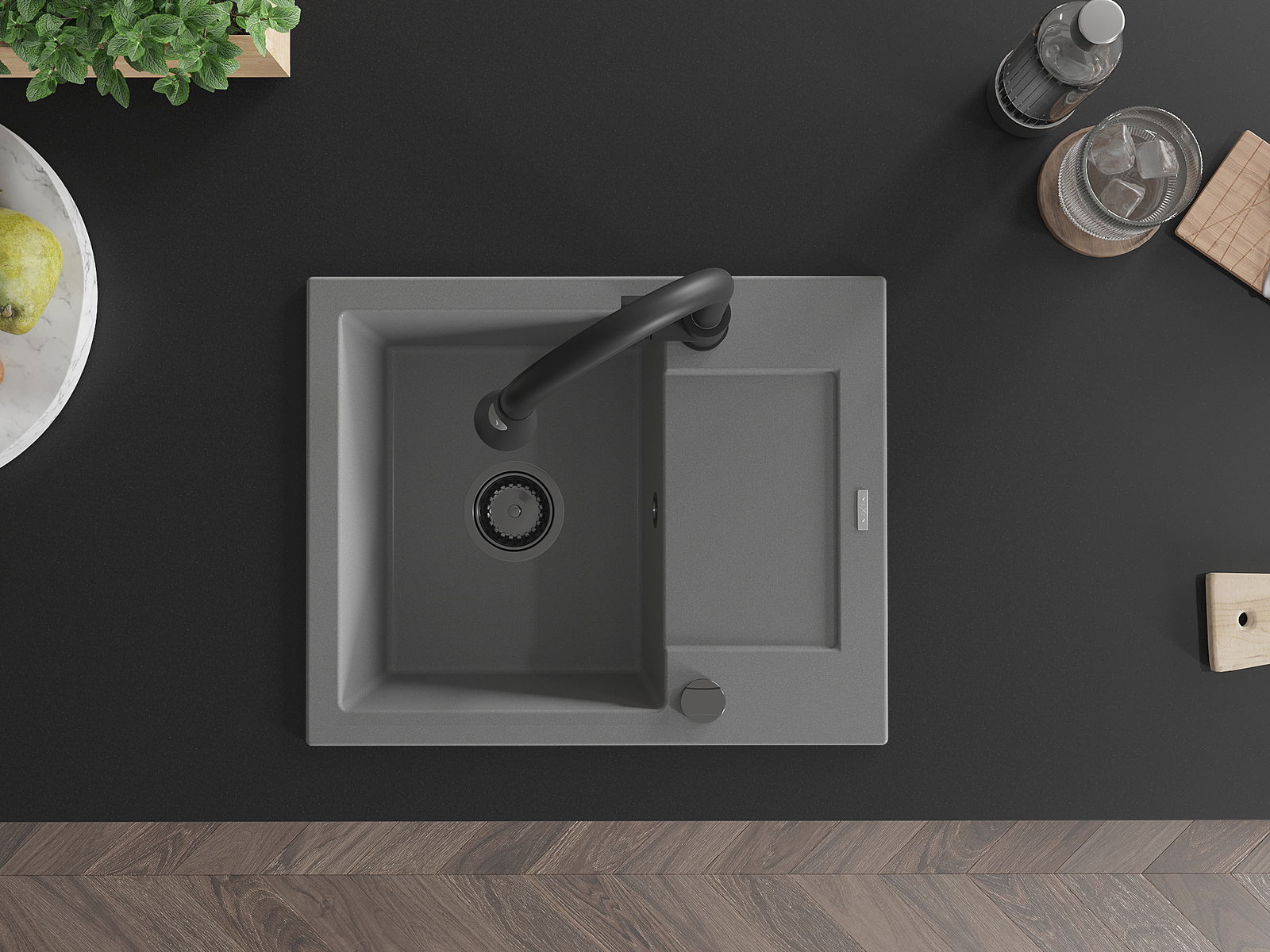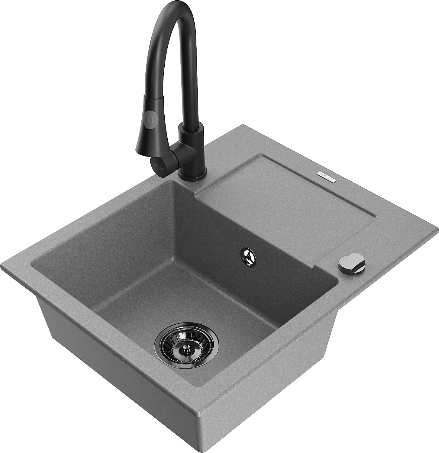 Mexen Enzo vienos dubenėlės granito plautuvė su nusausintuvu ir virtuviniu Elia maišytuvu, pilkas - 6506-71-670101-70-B