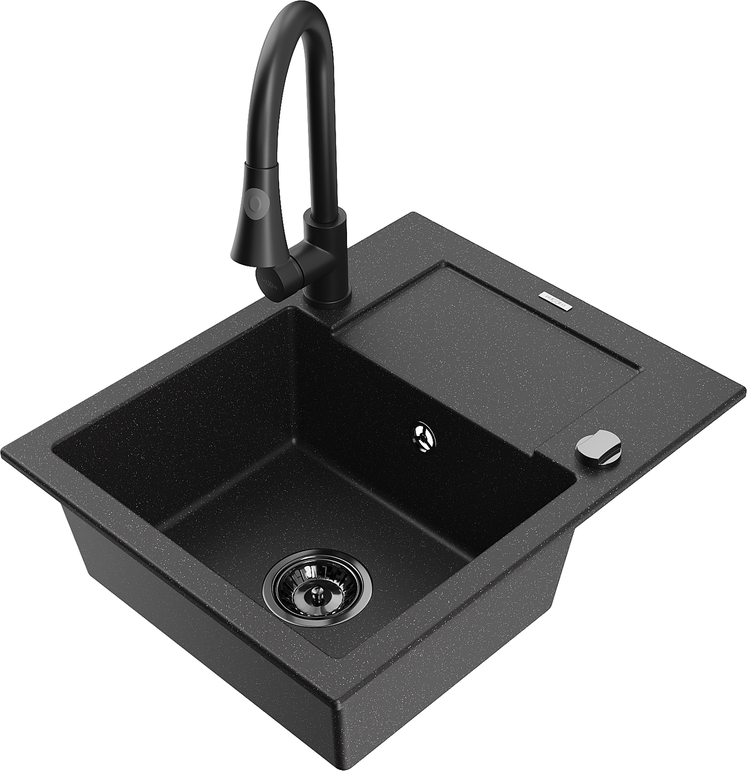 Mexen Enzo granitinė vienos kameros kriauklė su lašintuvu ir virtuviniu maišytuvu Elia, juoda/sidabrinė metalo spalva