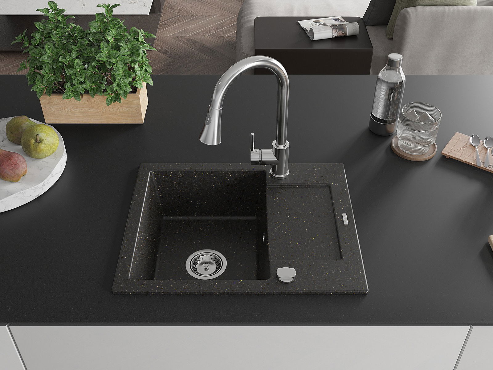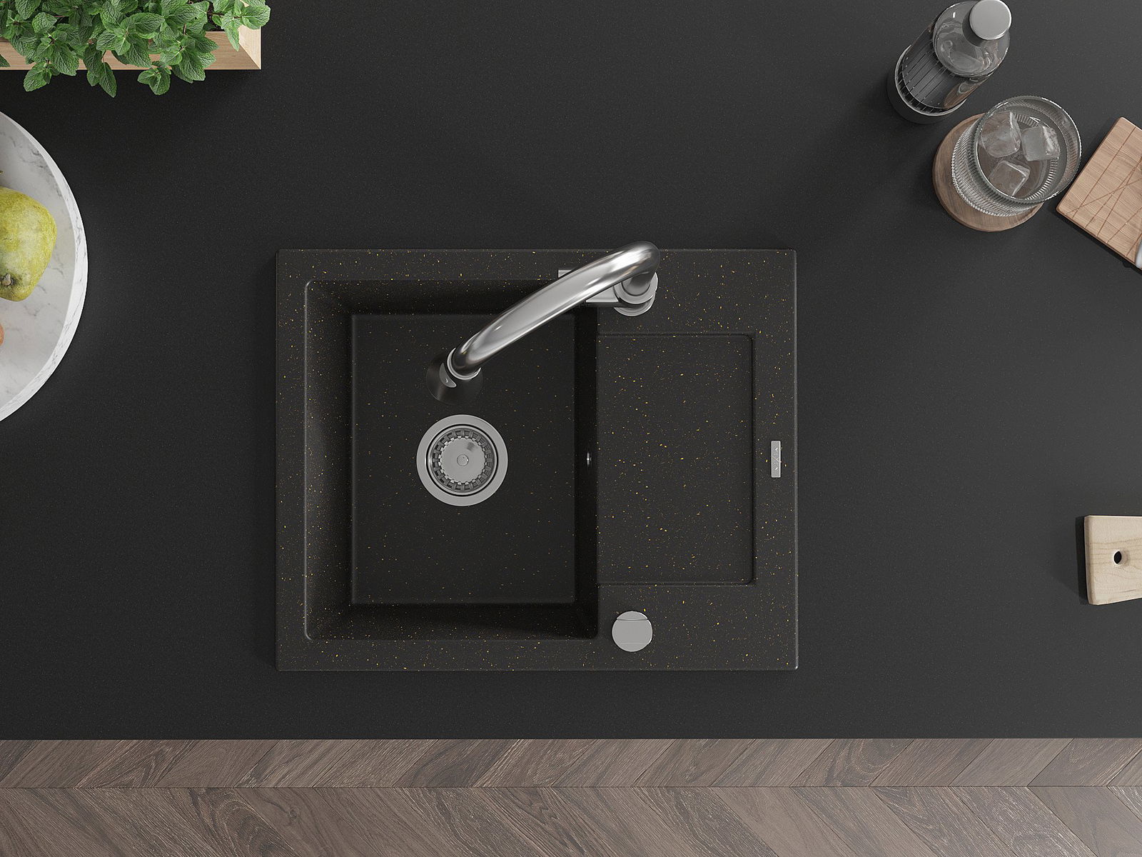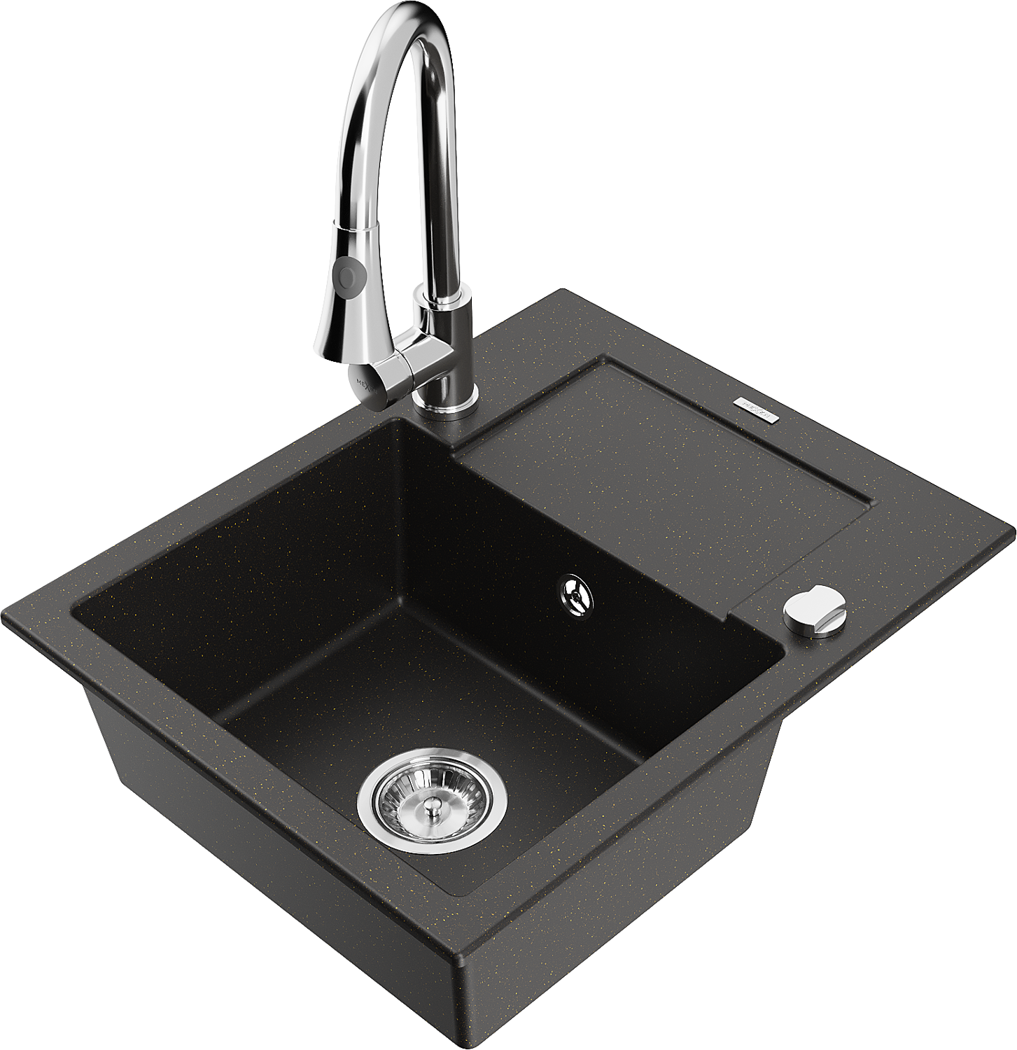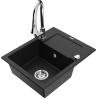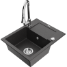 Mexen Enzo granitinė vienos kameros kriauklė su nusausintuvu ir virtuviniu maišytuvu Elia, juoda/auksinė metalika