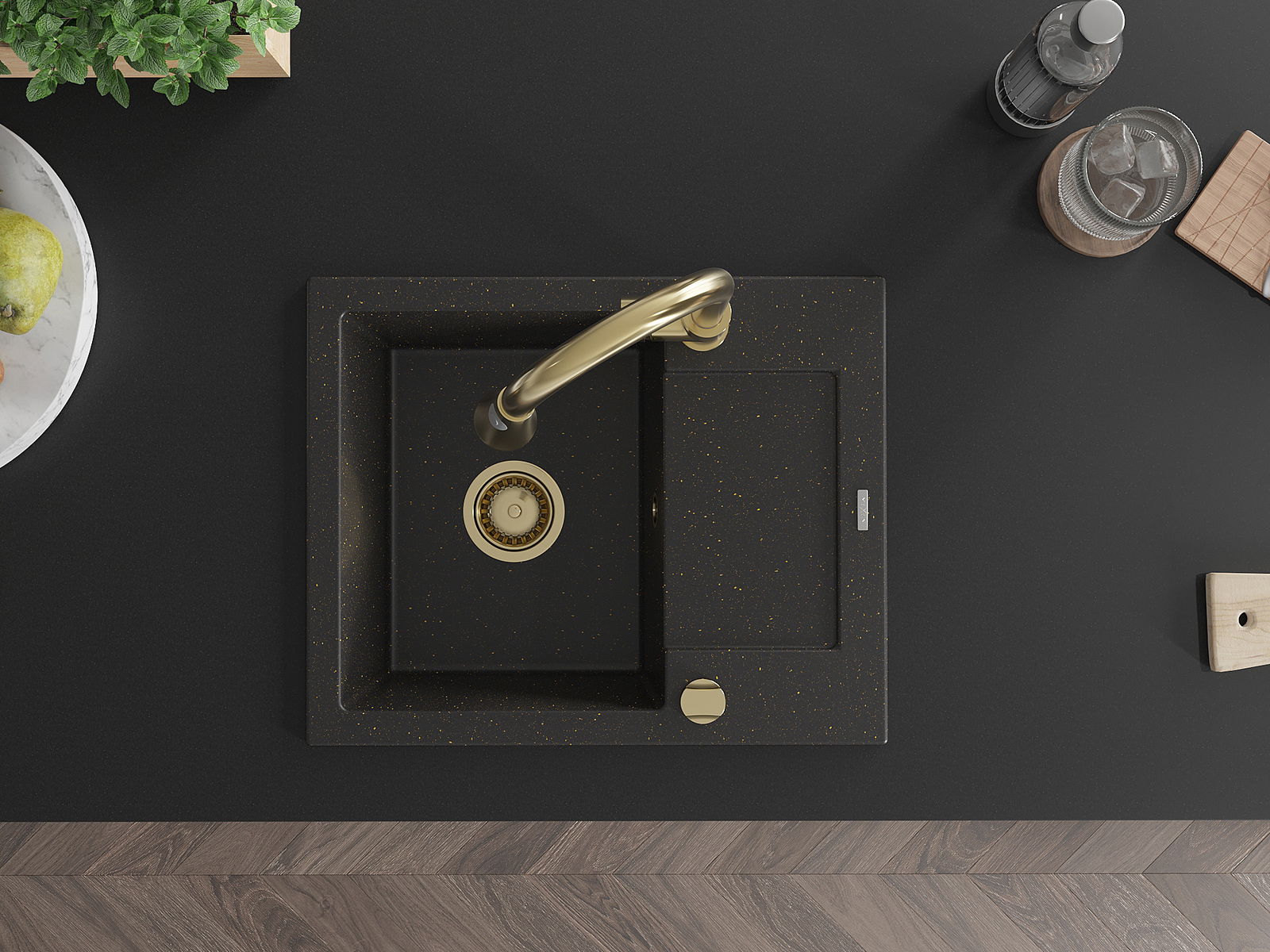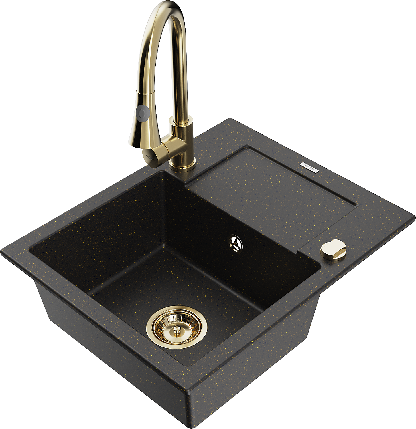 Mexen Enzo granito plautuvė 1 skyrius su lašintuvu ir virtuvės maišytuvu Elia, juoda/auksinė metalo - 6506-75-670101-50