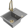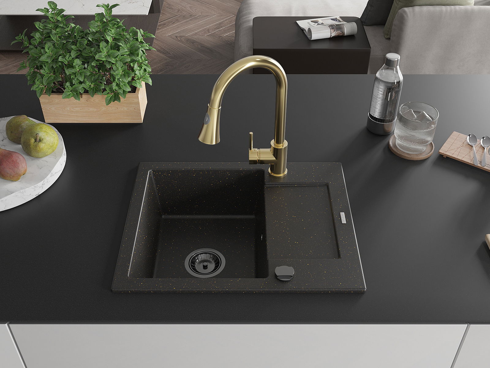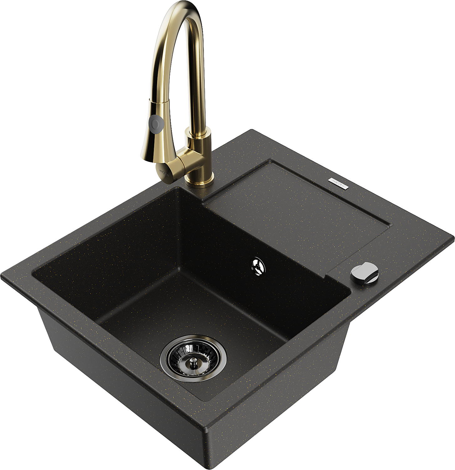 Mexen Enzo granitinė vienos kameros plautuvė su nusausintuvu ir virtuviniu maišytuvu Elia, juoda/auksinė metalo spalva