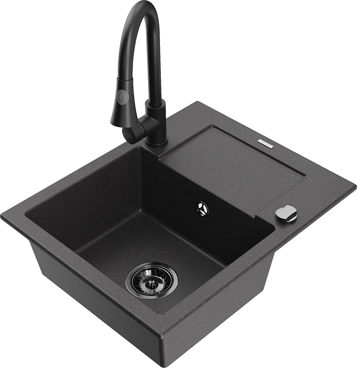 Mexen Enzo granikinė virtuvės kriauklė su viena talpa ir nuotaku bei virtuviniu maišytuvu Elia, juoda su taškais - 6506-76-6701?