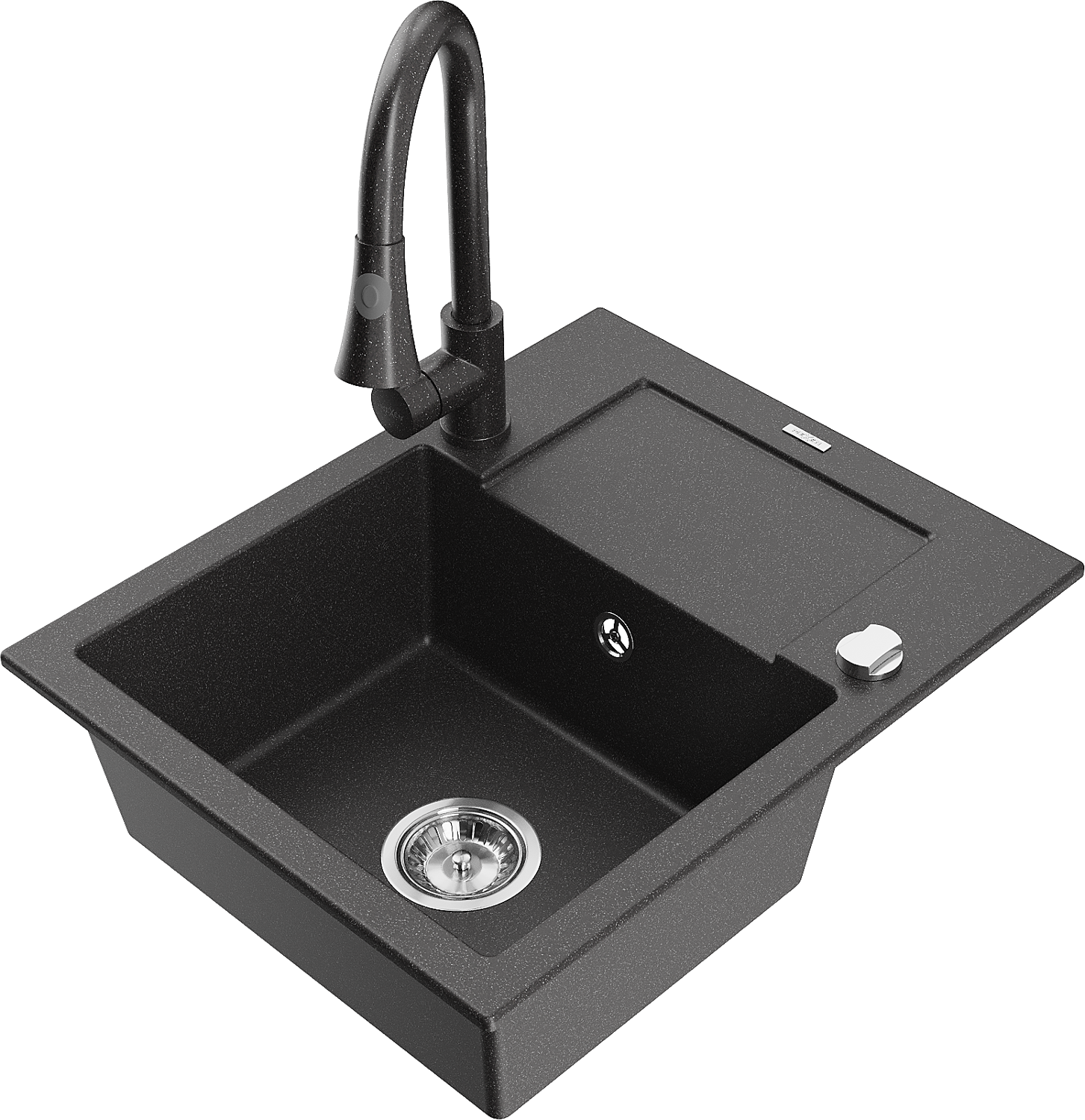 Mexen Enzo granitinė vienos kameros kriauklė su nusausintuvu ir virtuvės maišytuvu Elia, juodas dėmėtas