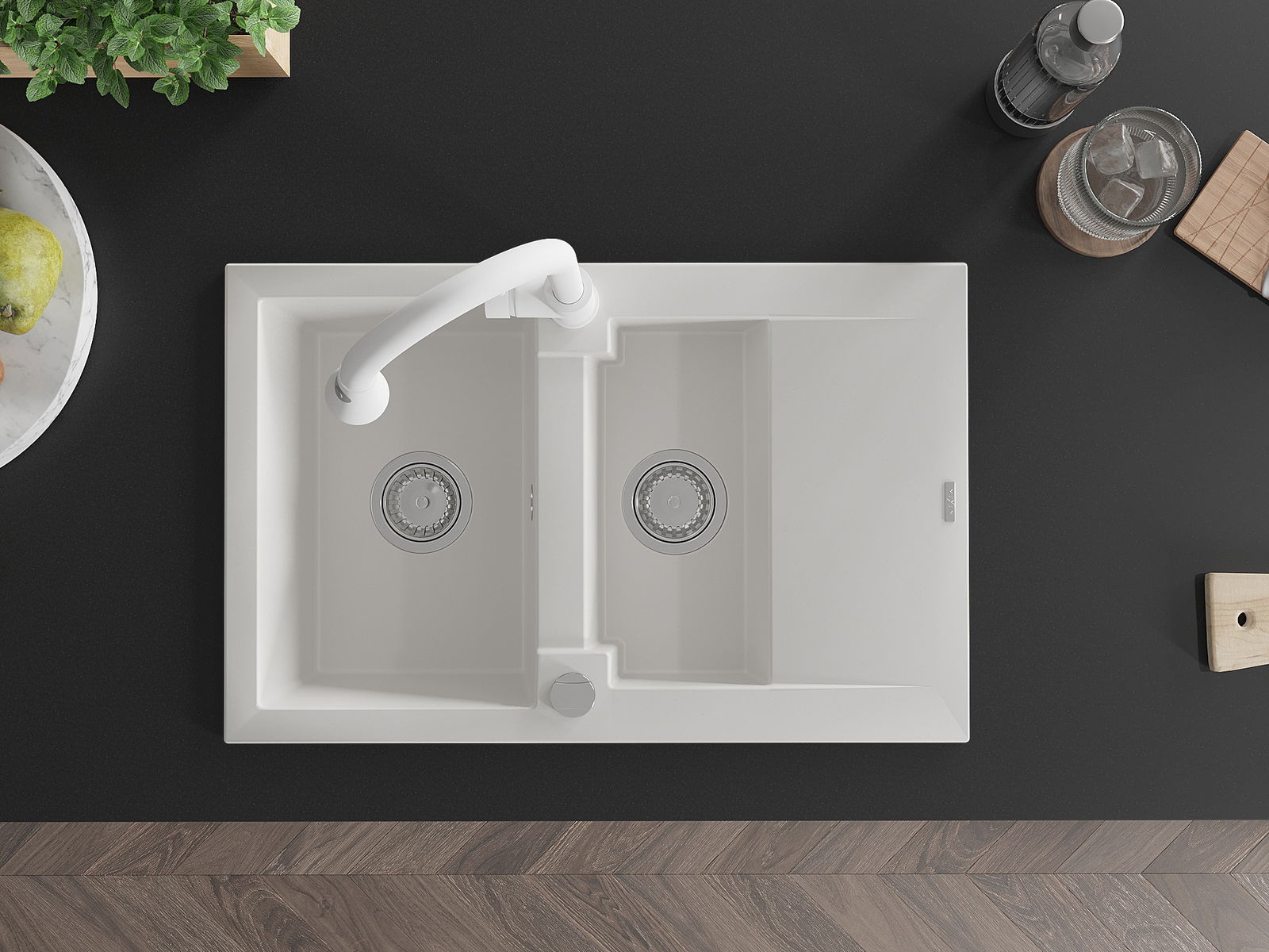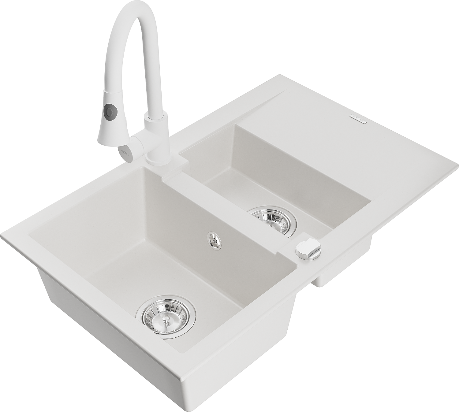 Mexen Gaspar 1,5 skyrių granito plautuvė su nutekėjimu ir virtuviniu maišytuvu Elia, balta - 6507-20-670101-20