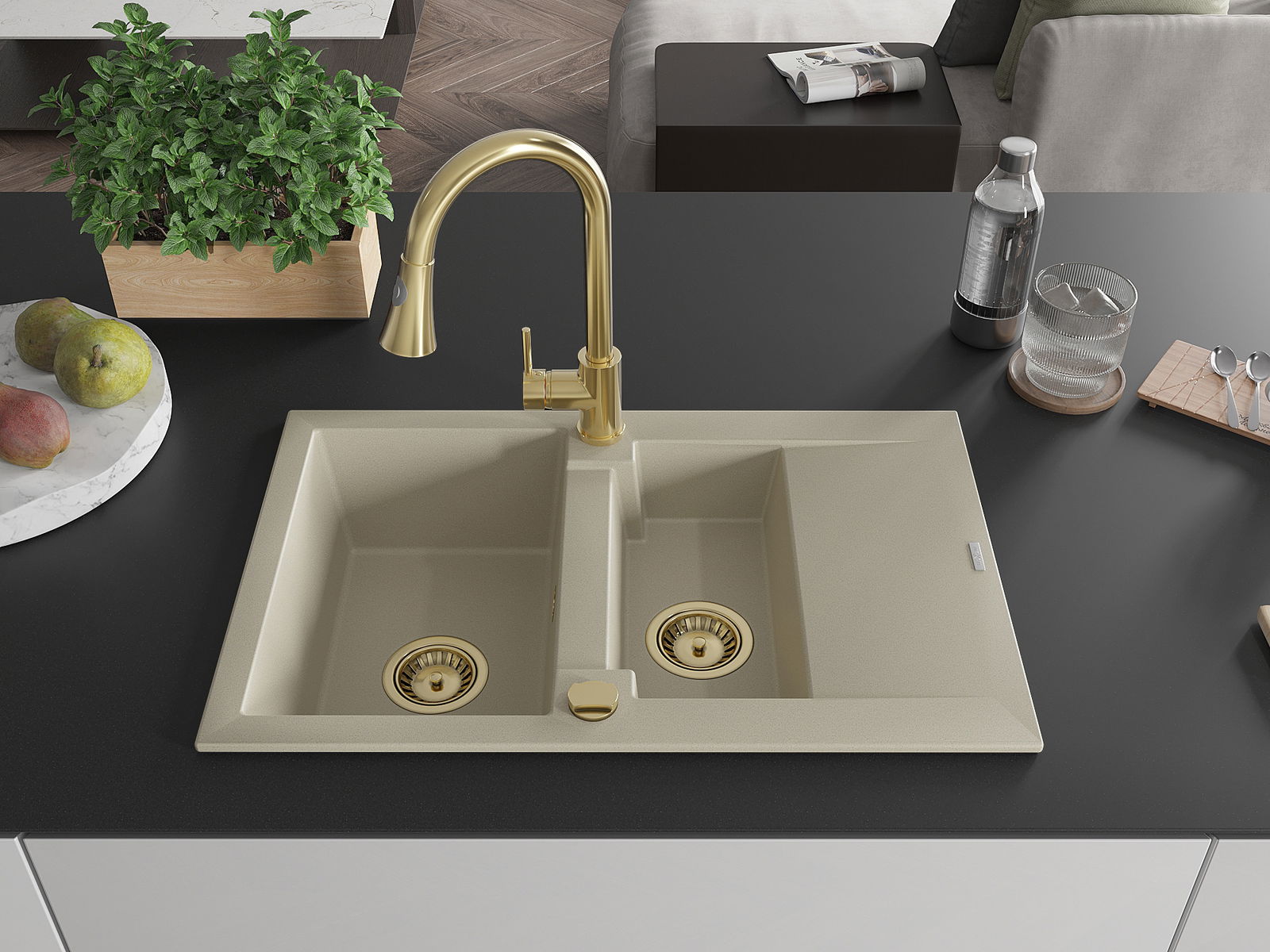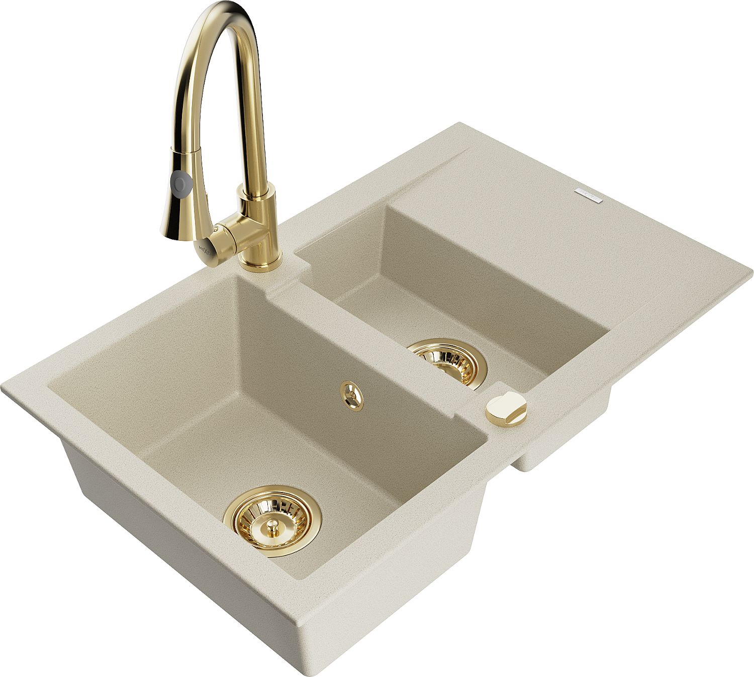 Mexen Gaspar granitinis kriauklė 1,5 kompos su nuvarvėjimo ir virtuvės maišytuvu Elia, smėlinis - 6507-69-670101-50