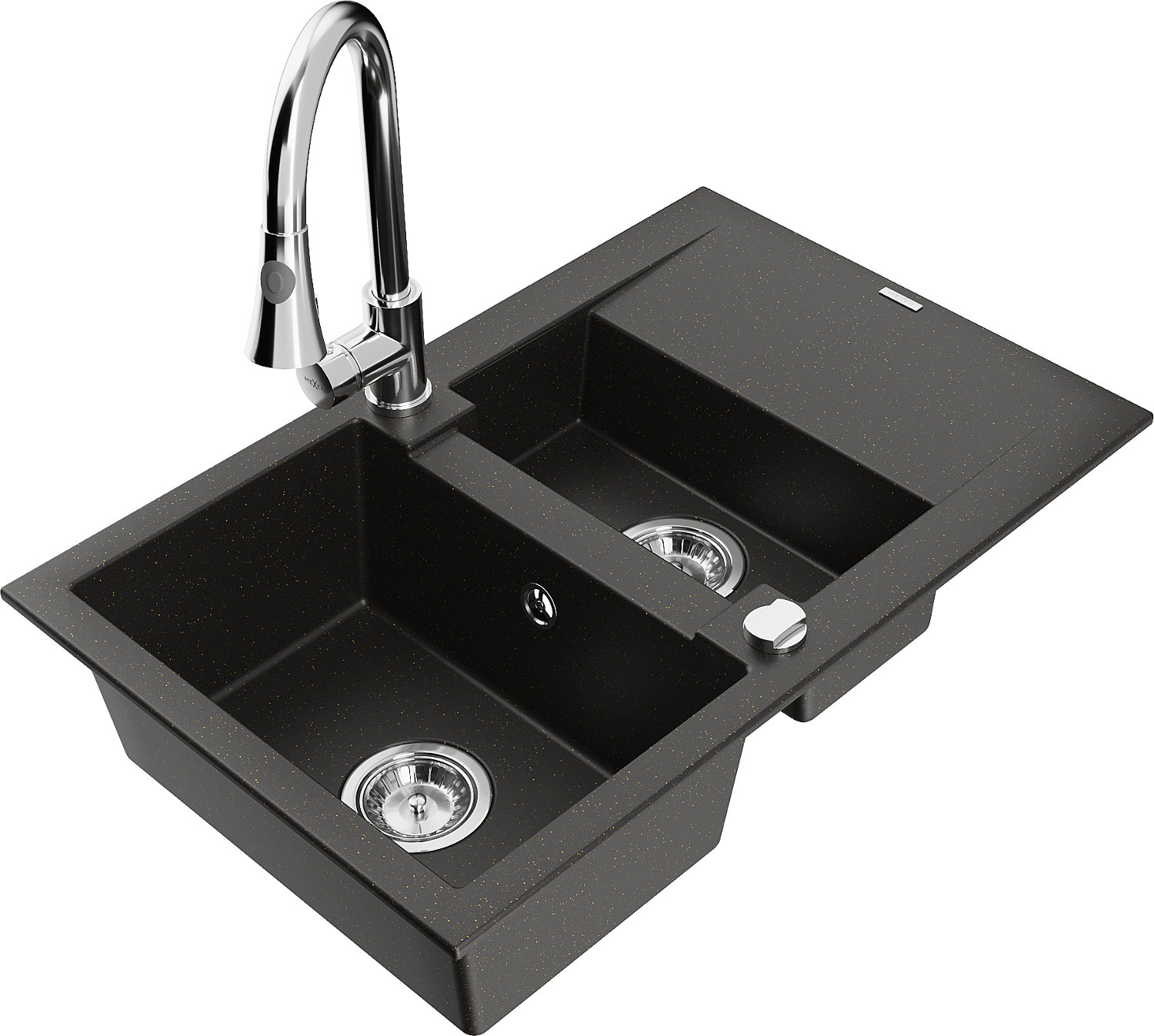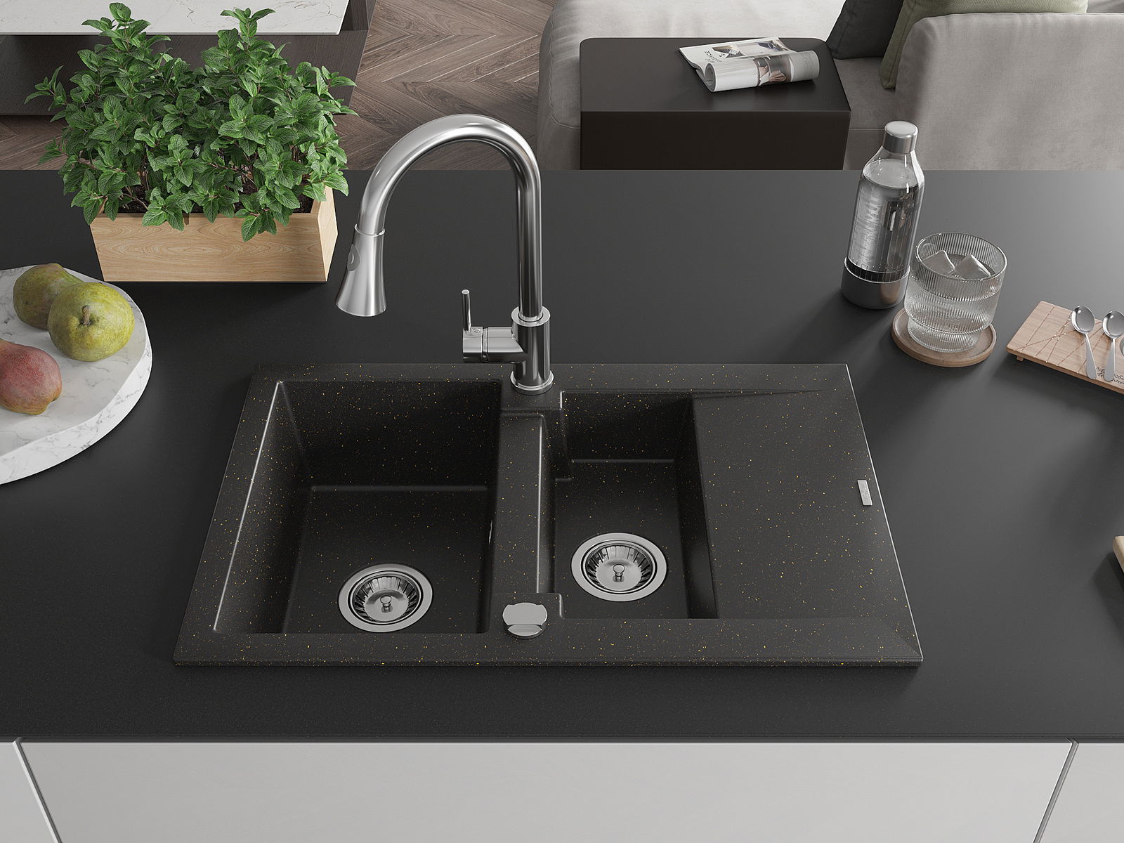 Mexen Gaspar 1,5 skylių granito kriauklė su nutekamuoju paviršiumi ir virtuviniu maišytuvu Elia, juodos/auksinės spalvos