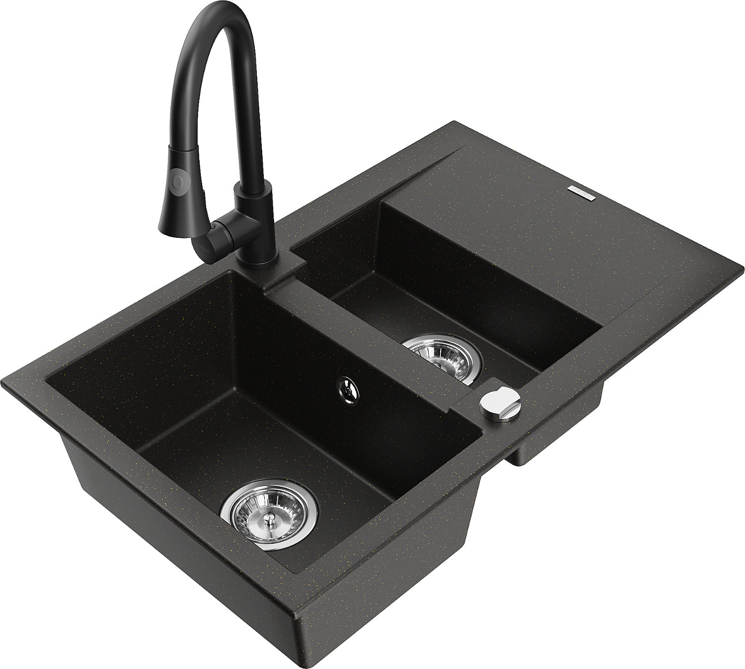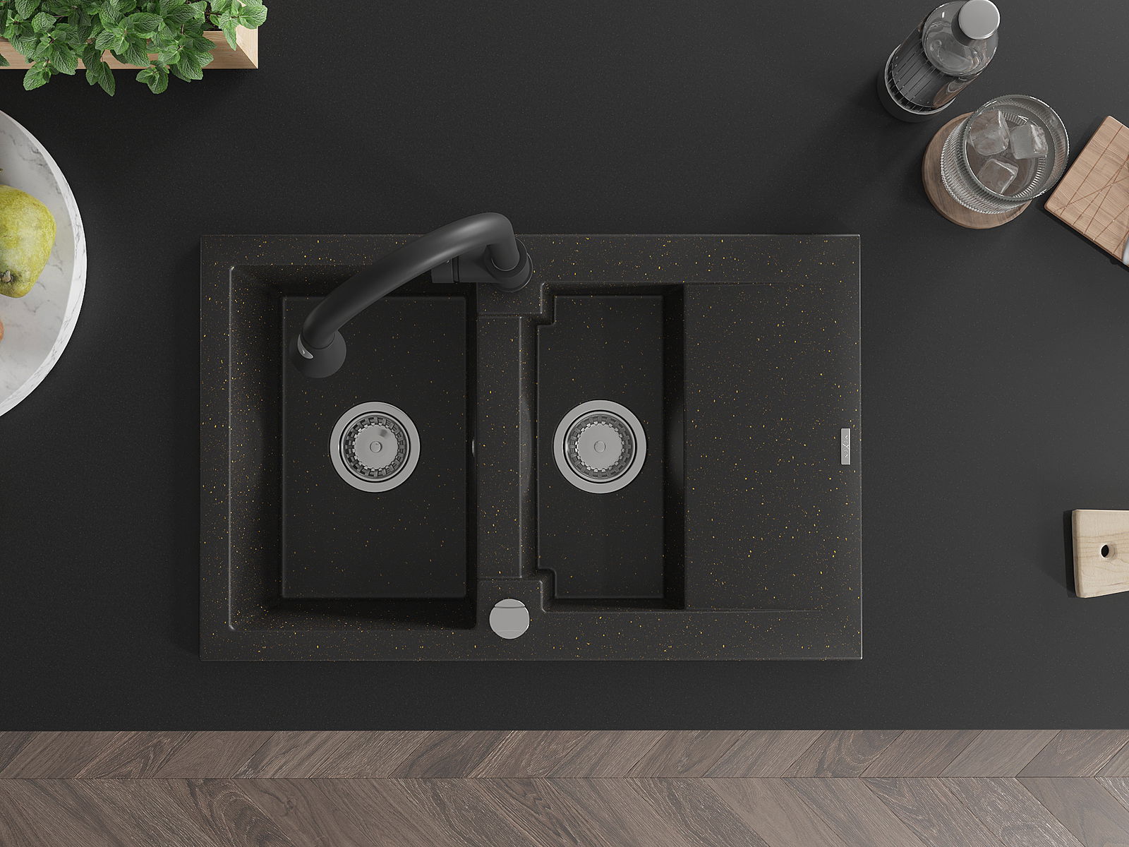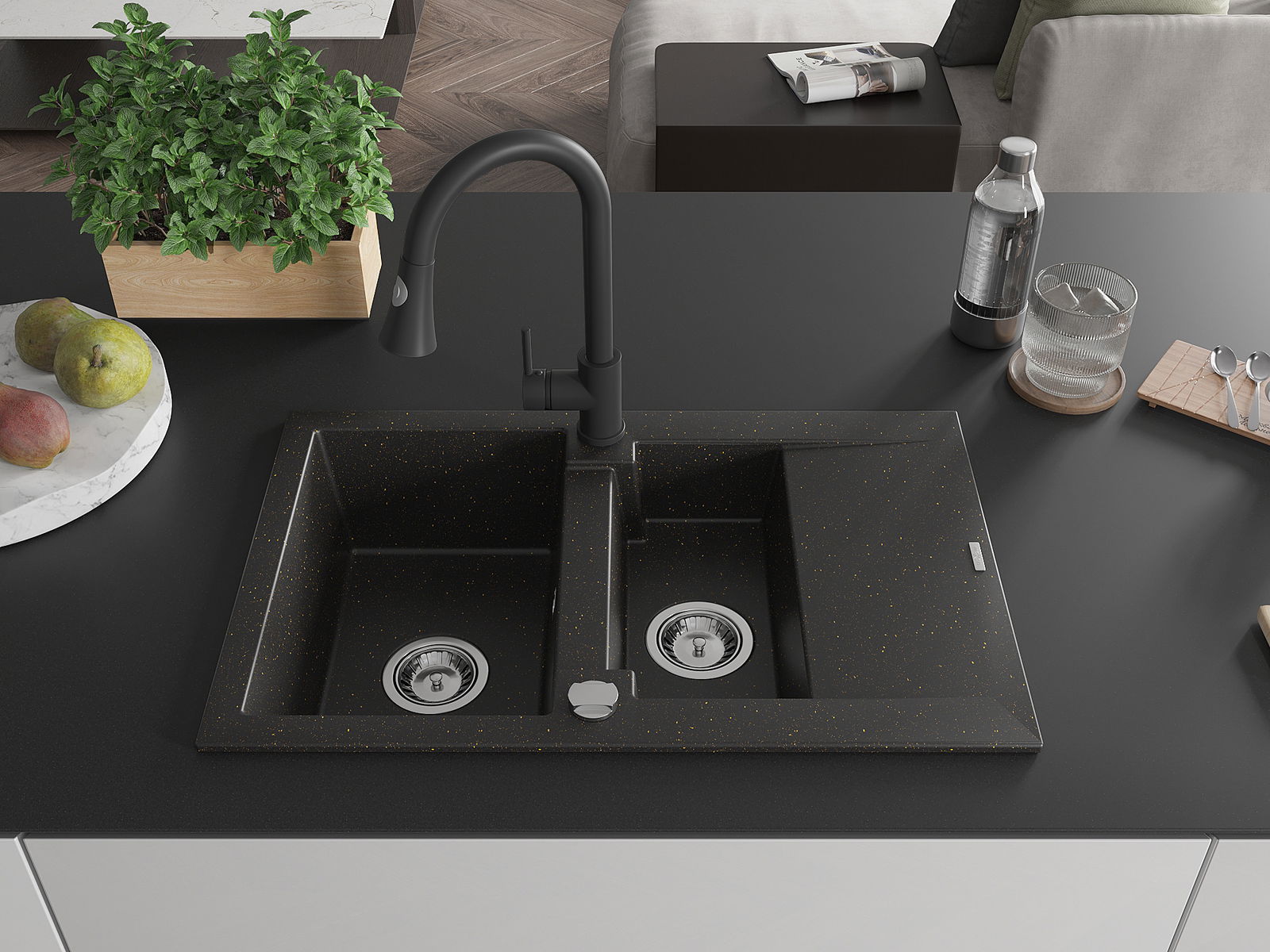 Mexen Gaspar granitinė 1,5 skalbykla su drenažu ir virtuvės maišytuvu Elia, juodas/auksinis metalikas - 6507-75-670101-70