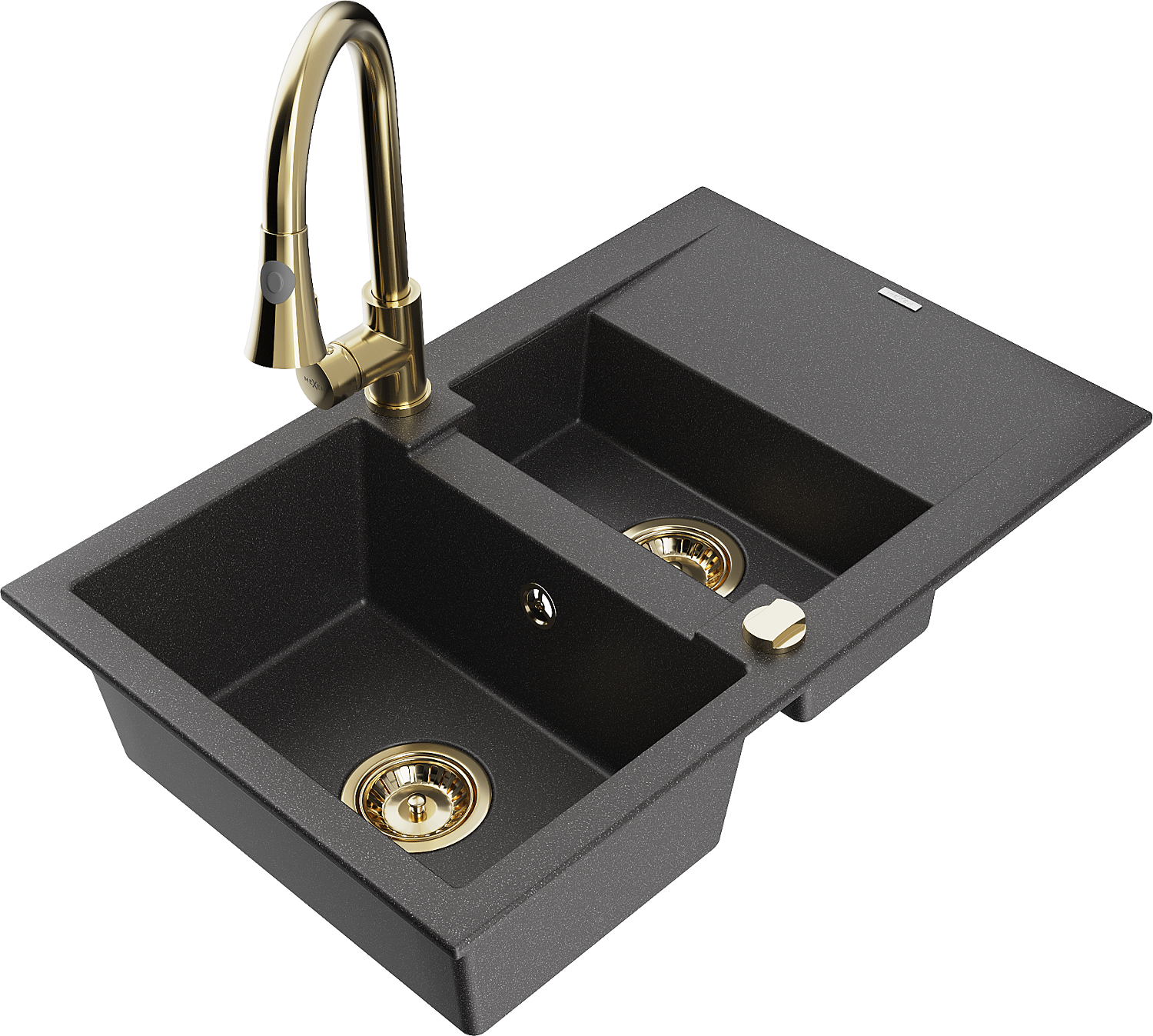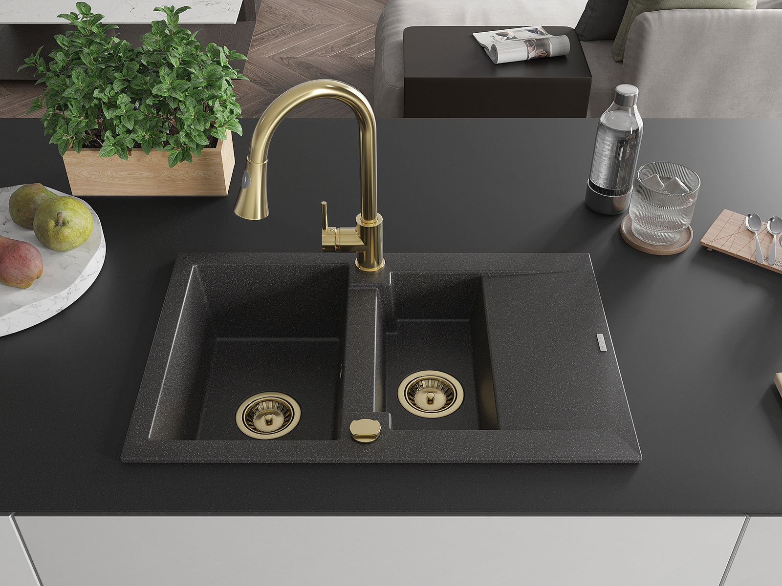 Mexen Gaspar granito plautuvė 1,5-dubenio su nusausintuvu ir virtuviniu maišytuvu Elia, juodas dėmėtas - 6507-76-670101-50