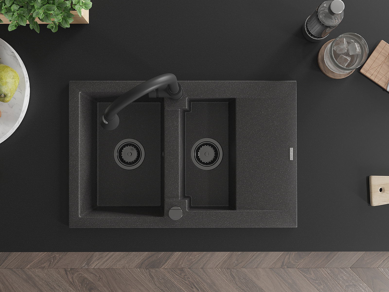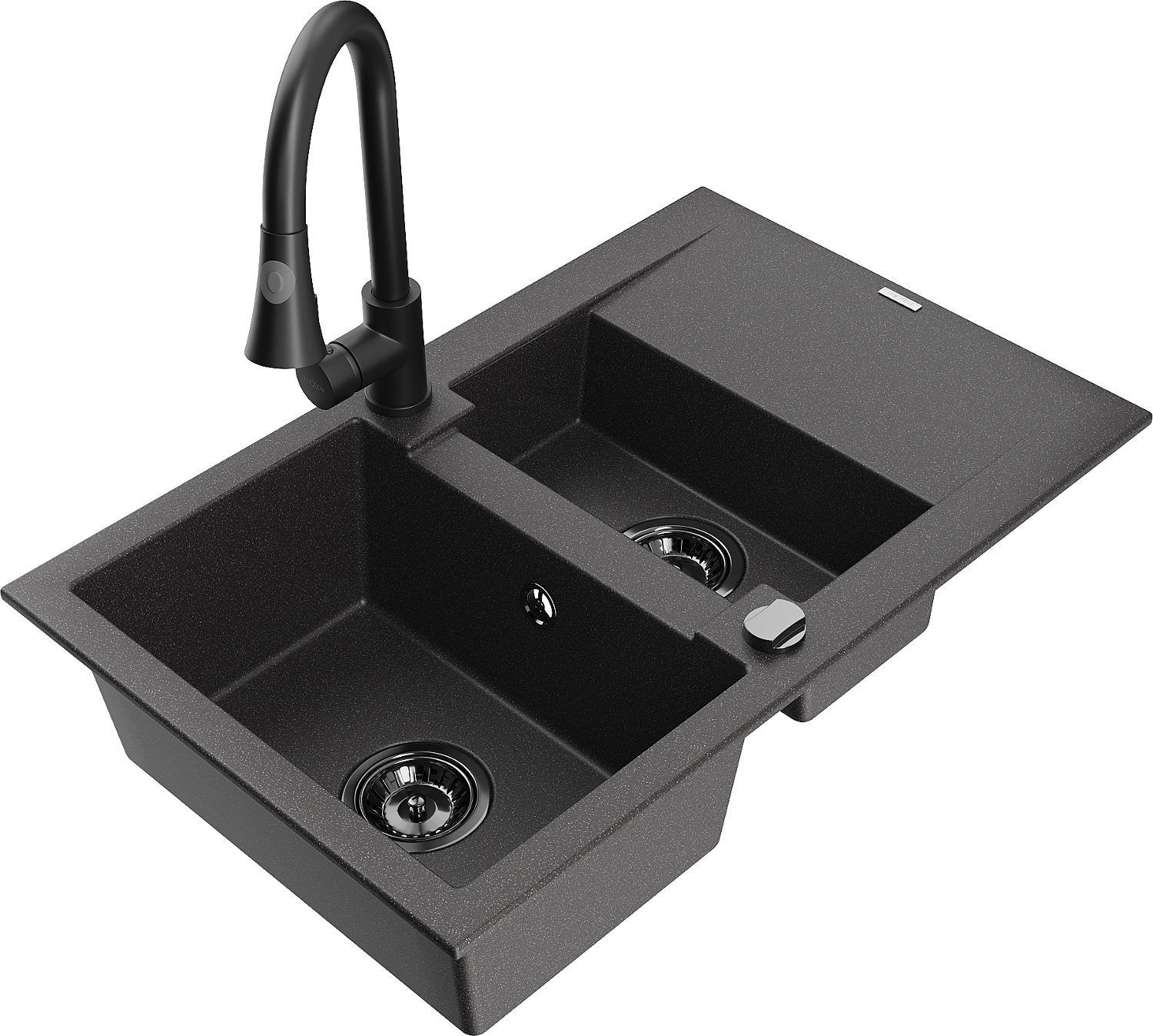 Mexen Gaspar granitinė 1,5-kamerinė kriauklė su stalviršiu ir virtuviniu maišytuvu Elia, juoda dėmėta