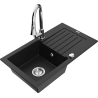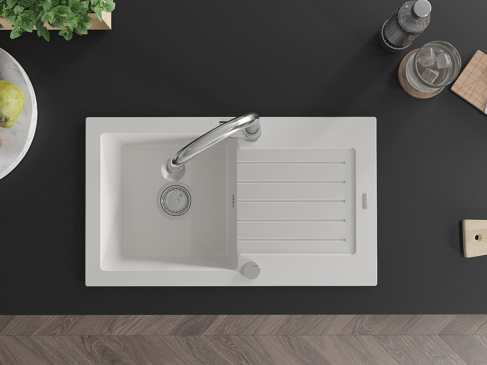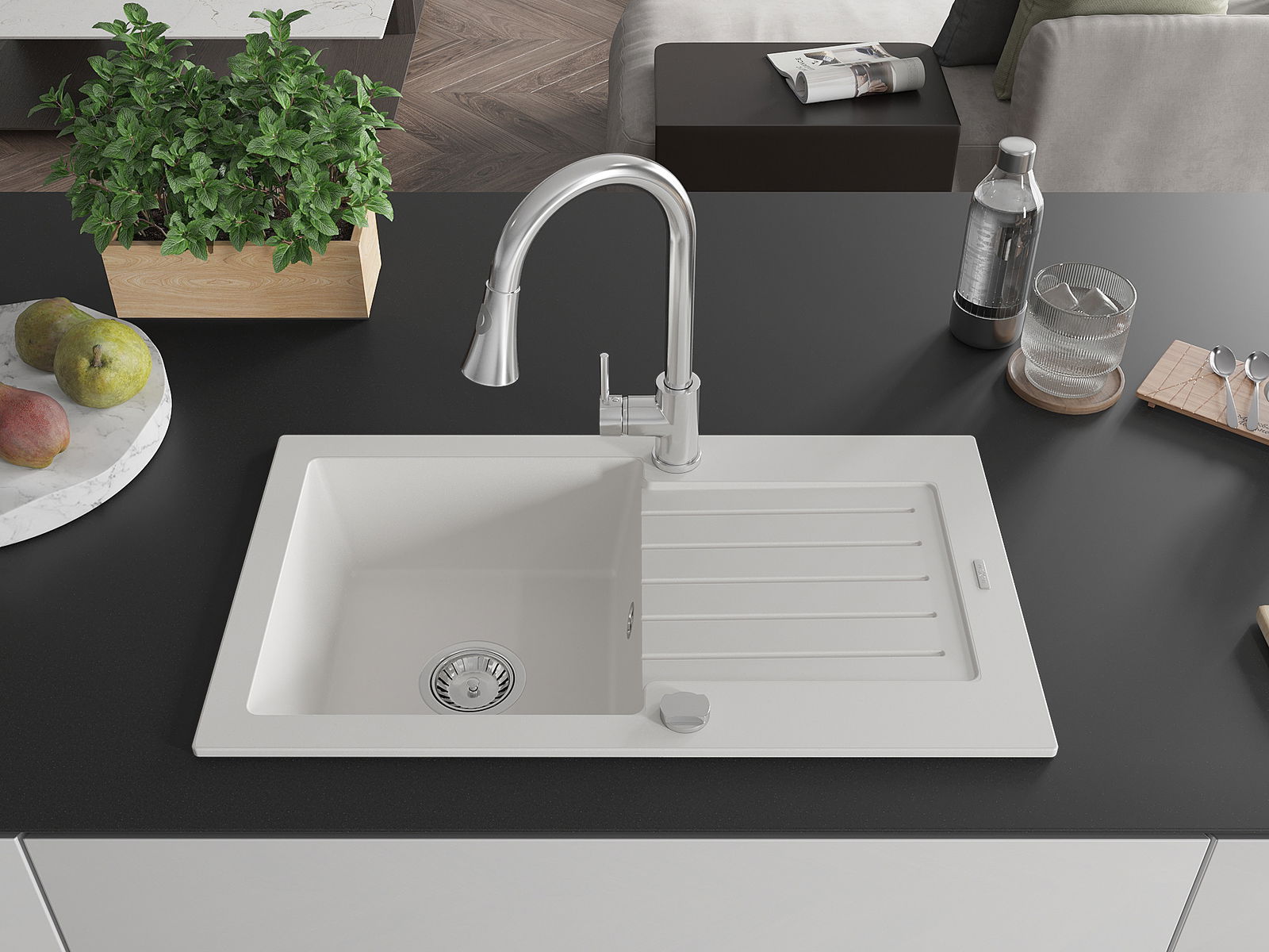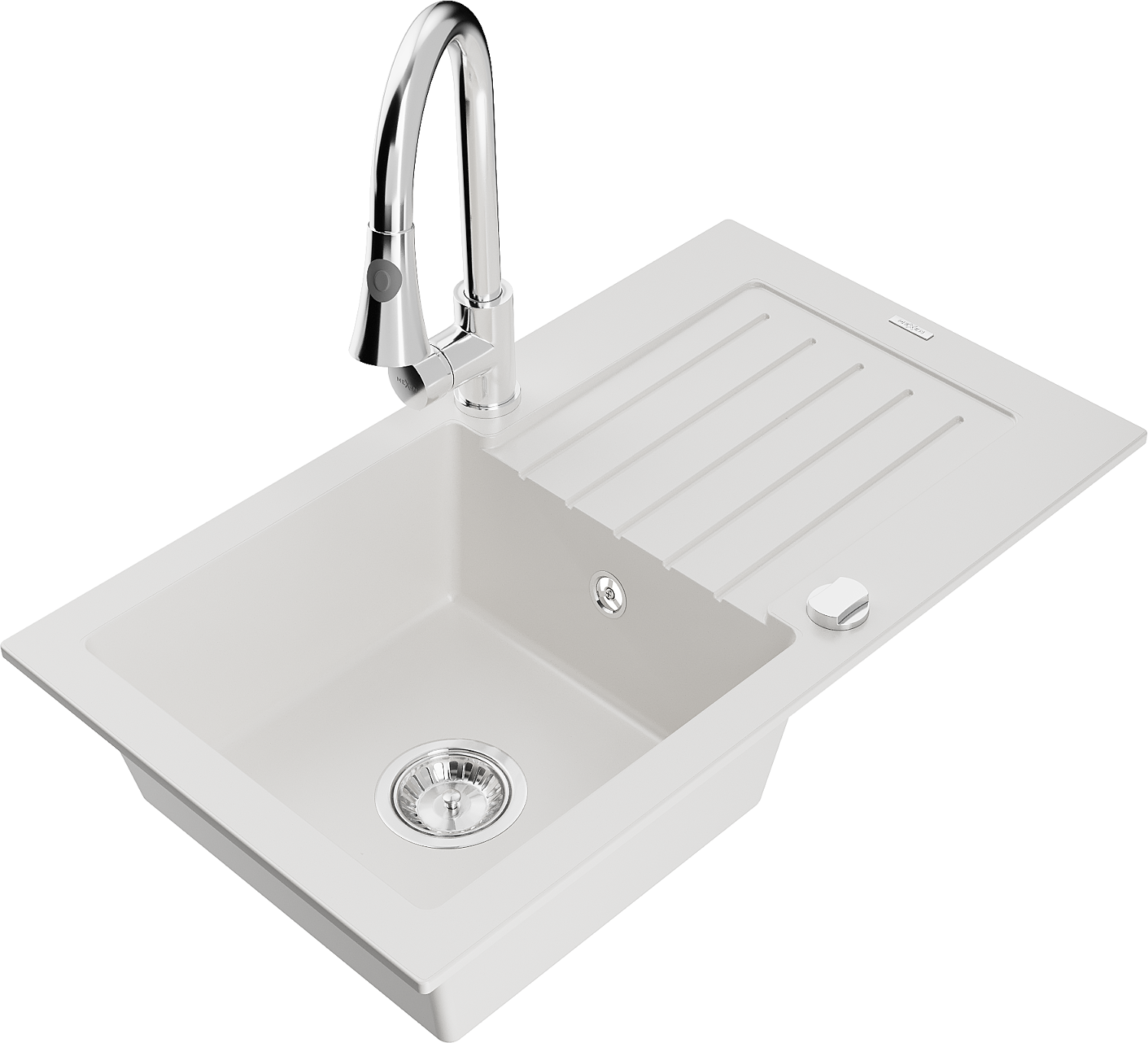 Mexen Pablo granito virtuvės plautuvė 1 skyrelio su nubėgėliu ir virtuviniu maišytuvu Elia, balta - 6510-20-670101-00