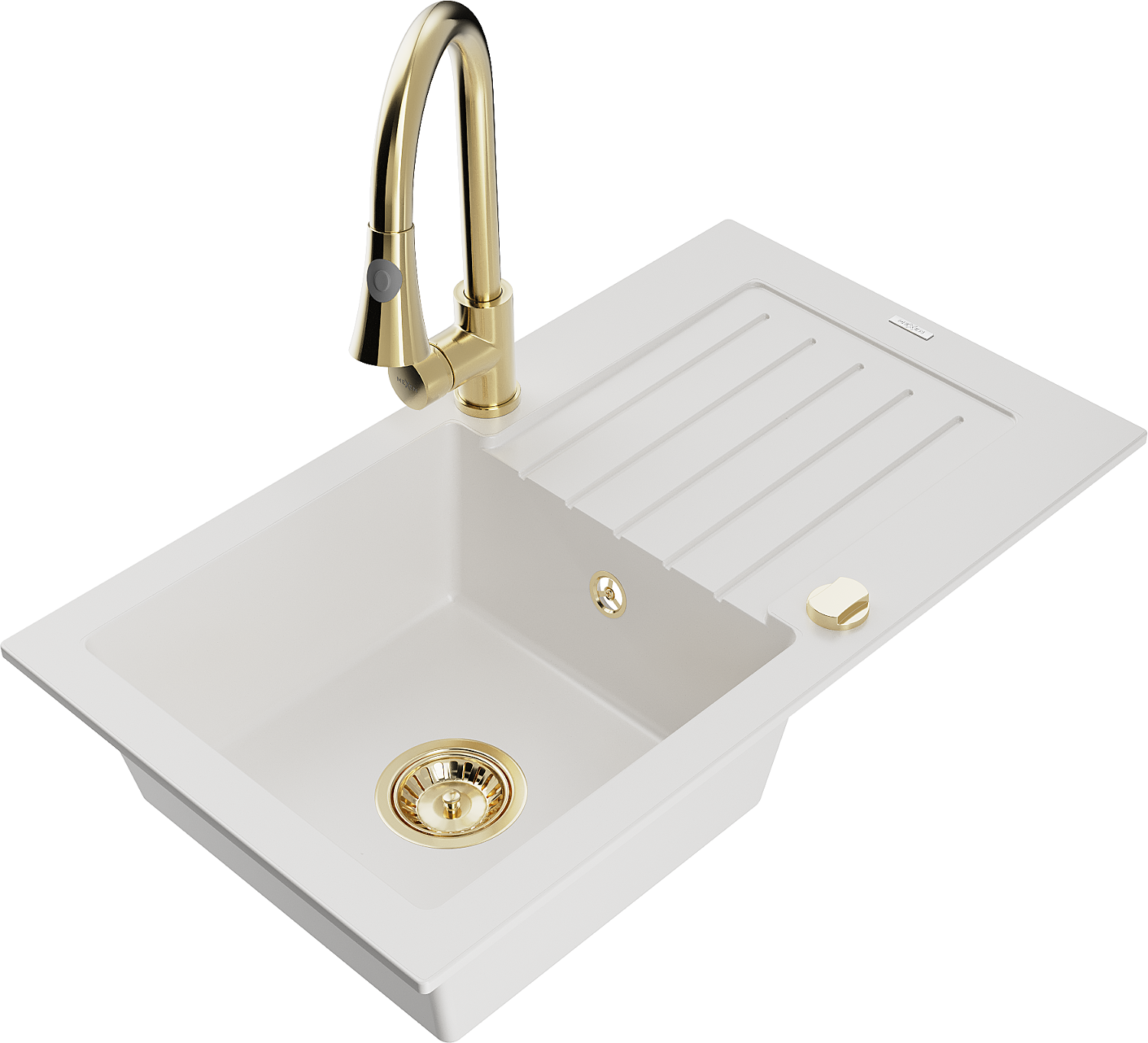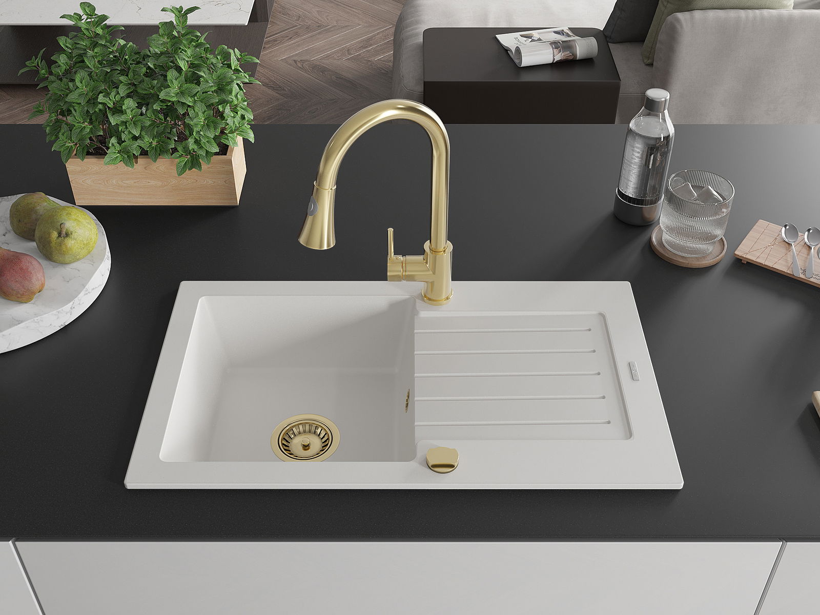 Mexen Pablo granitinė plautuvė su 1 dubeniu, lašų surinkimo vieta ir Elia virtuvės čiaupu, balta - 6510-20-670101-50