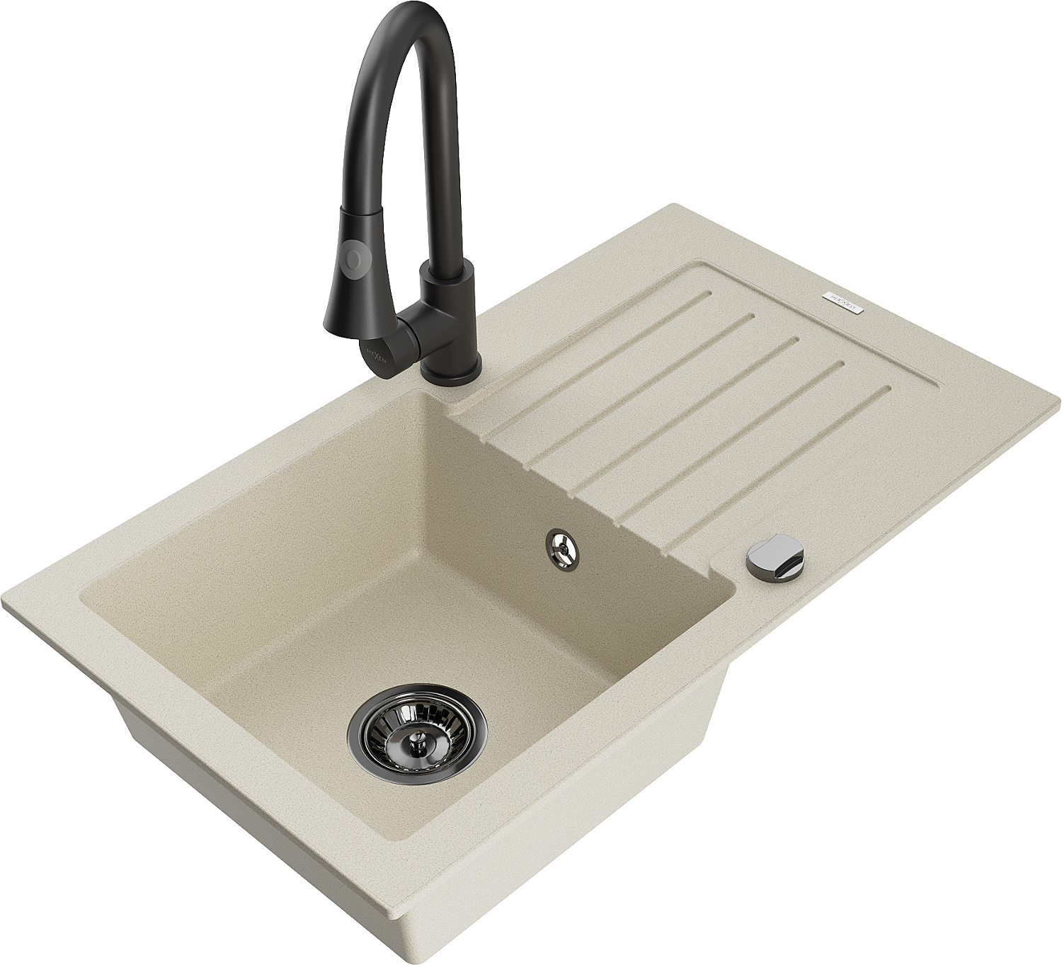 Mexen Pablo granitinė plautuvė, 1 skyrius su nuvarvėjimo zona ir virtuviniu maišytuvu Elia, smėlio spalvos - 6510-69-670101-70