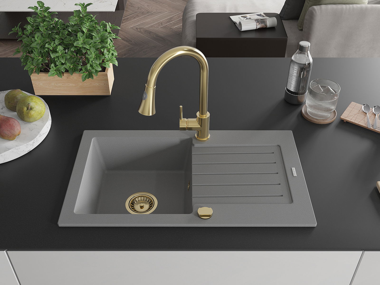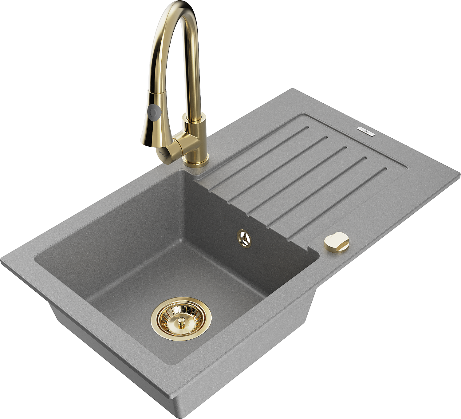 Mexen Pablo granitinė vienos kameros plautuvė su nutekėjimu ir virtuviniu maišytuvu Elia, pilka - 6510-71-670101-50